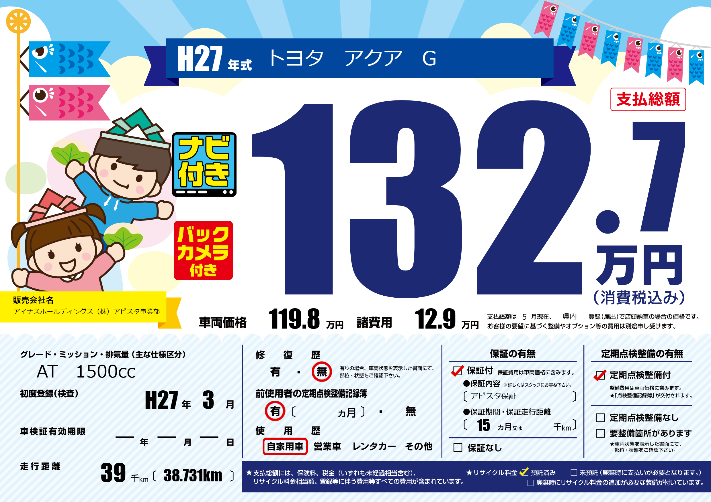 | 車名 | トヨタ アクア G | グレード ミッション 排気量 |