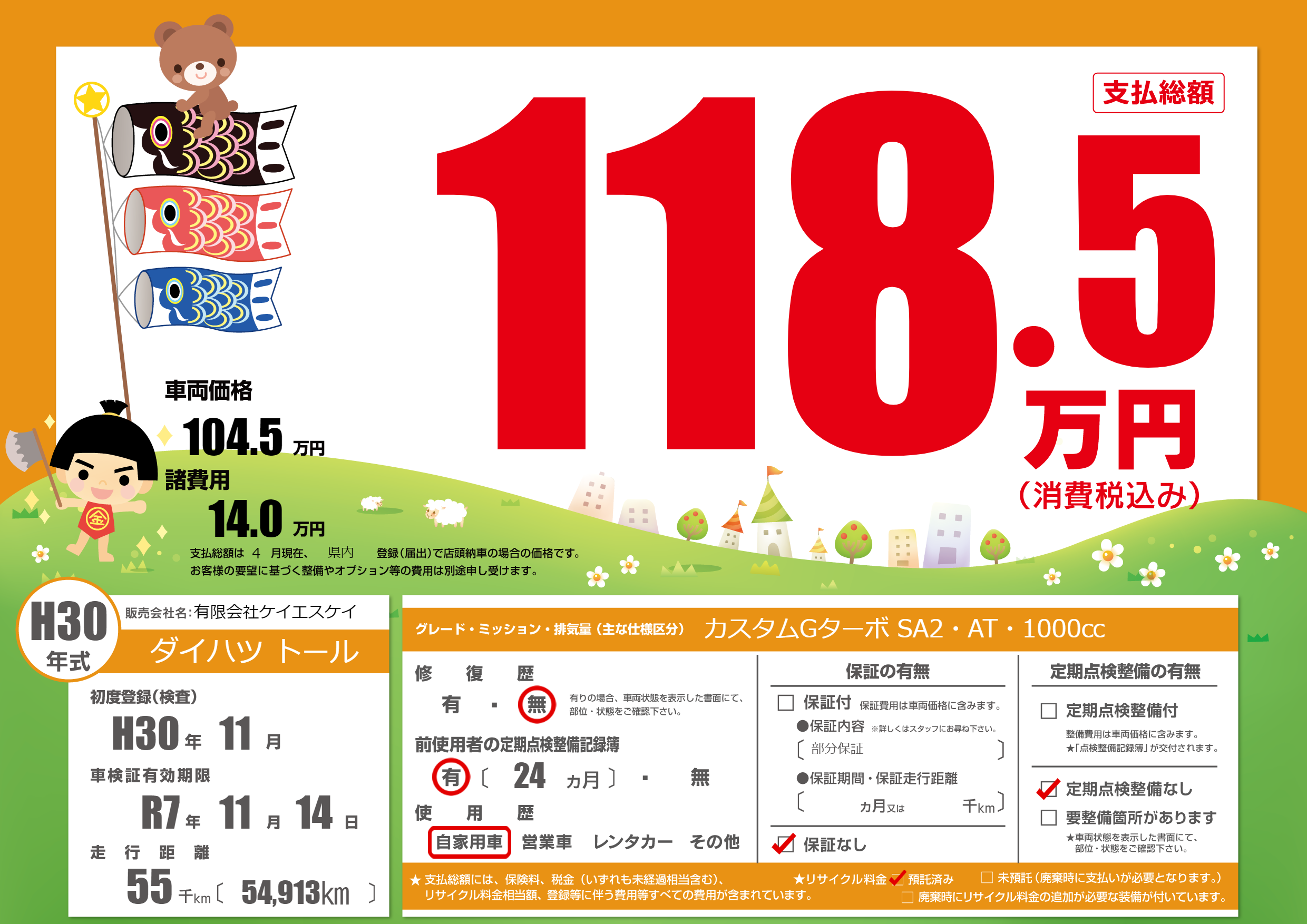 | 走行キロ | 5.5万km | 初年度登録 | H30年11月 |