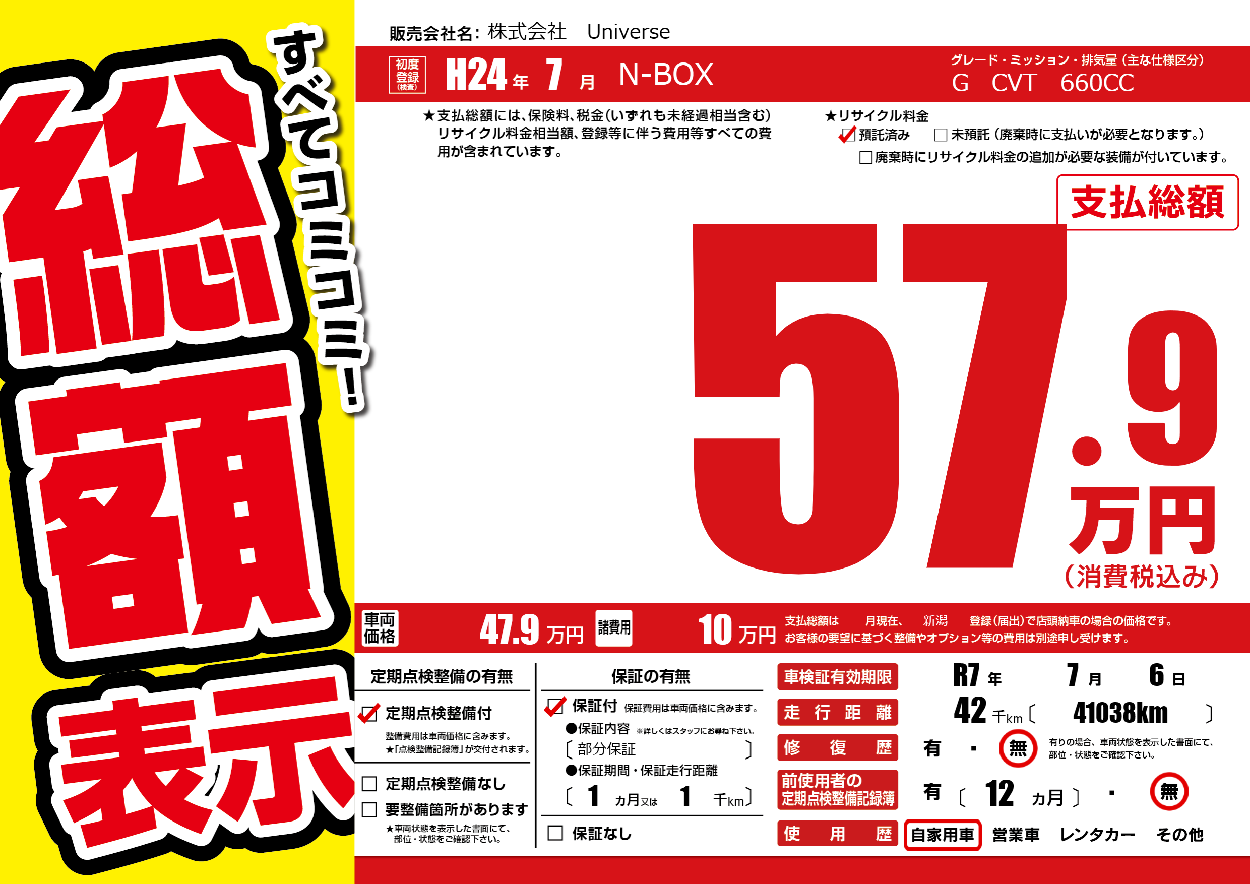| 走行キロ | 4.2万km | 初年度登録 | H24年7月 |