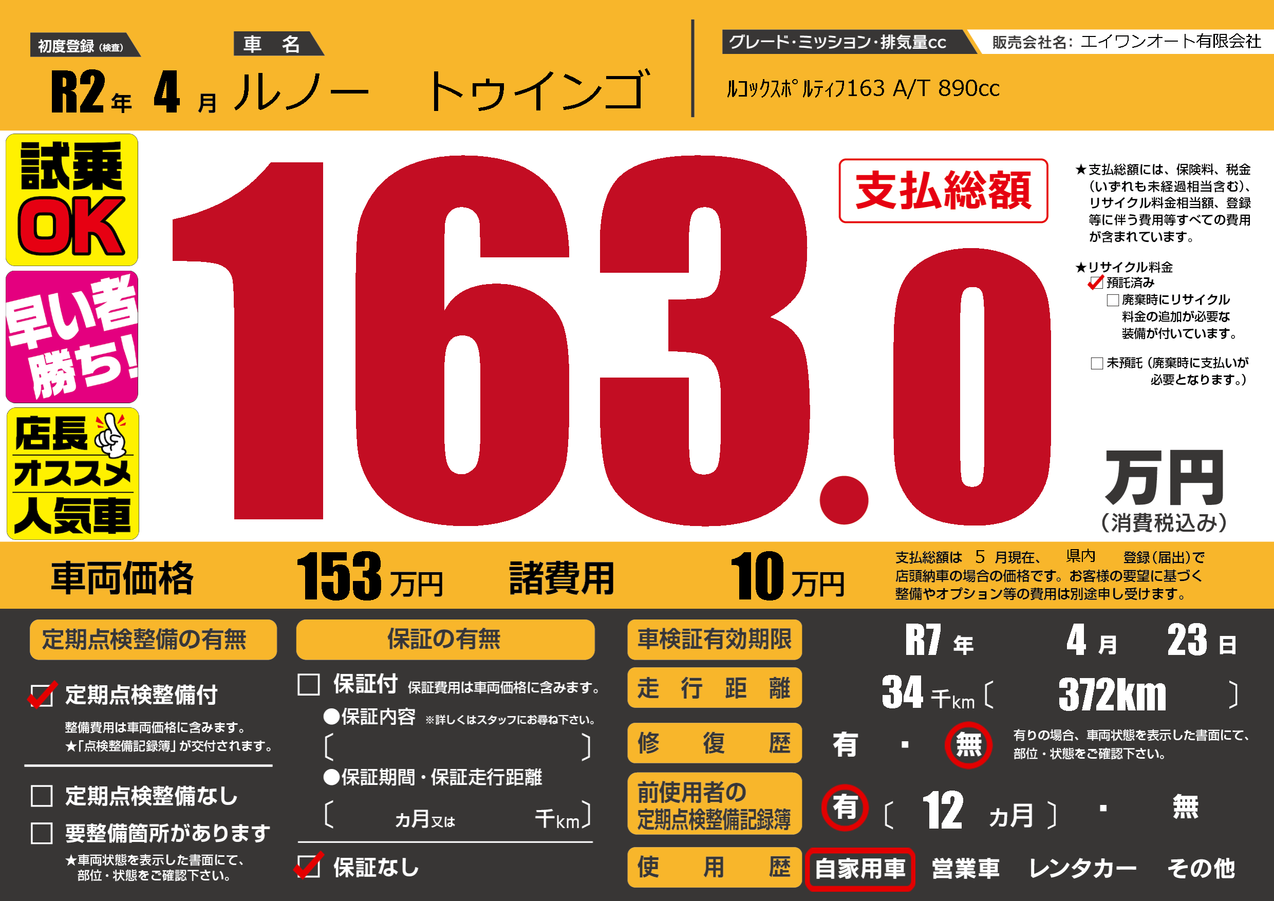 | 車検制限 | R7年 4月 23日 | ||