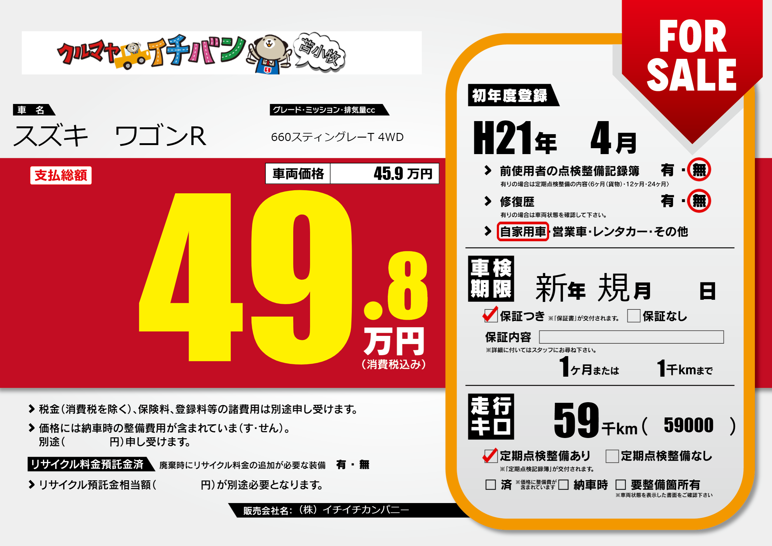 | 車名 | スズキ ワゴンR | グレード ミッション 排気量 |