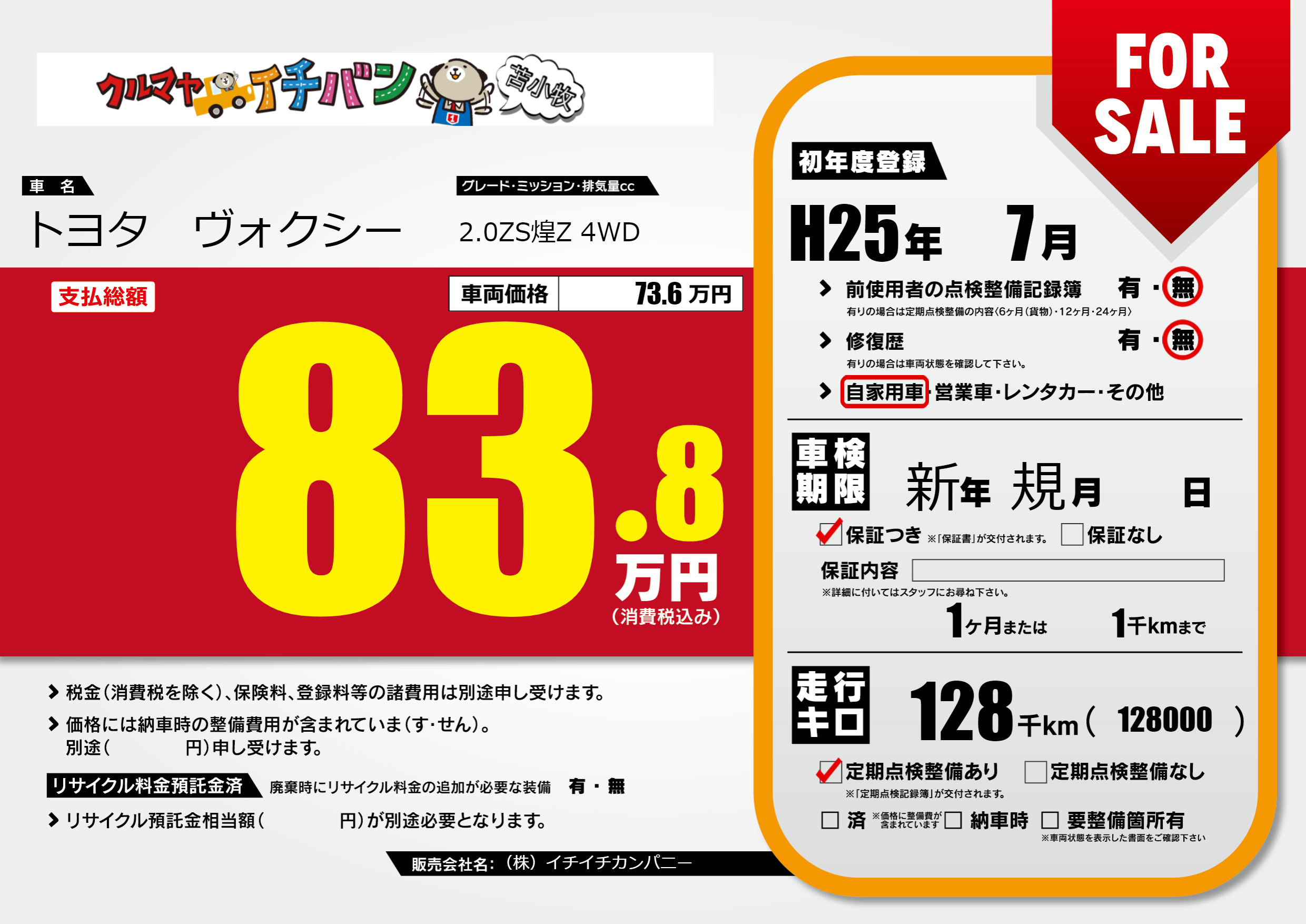 | 走行キロ | 12.8万km | 初年度登録 | H25年7月 |