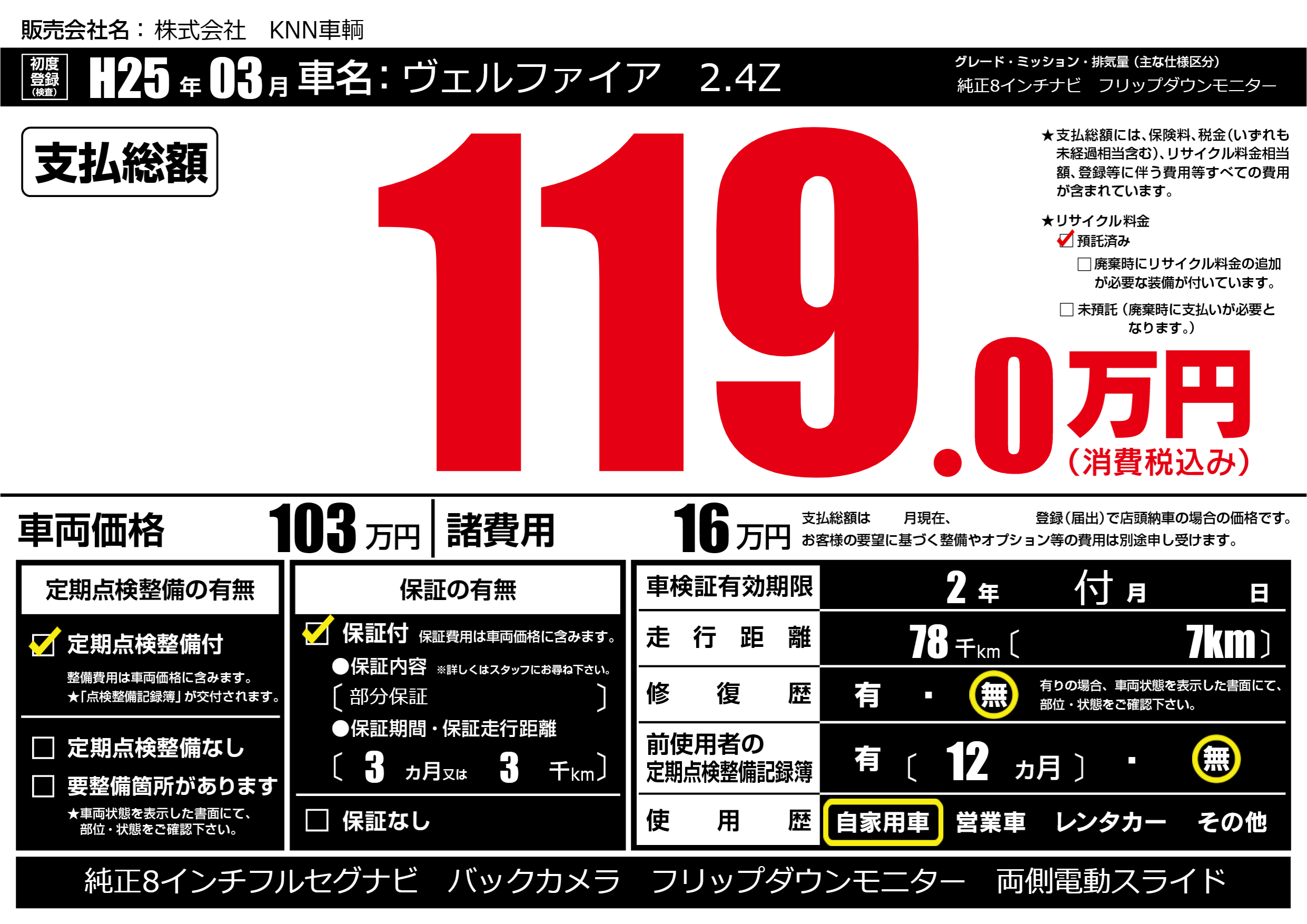 | 走行キロ | 7.8万km | 初年度登録 | H25年03月 |