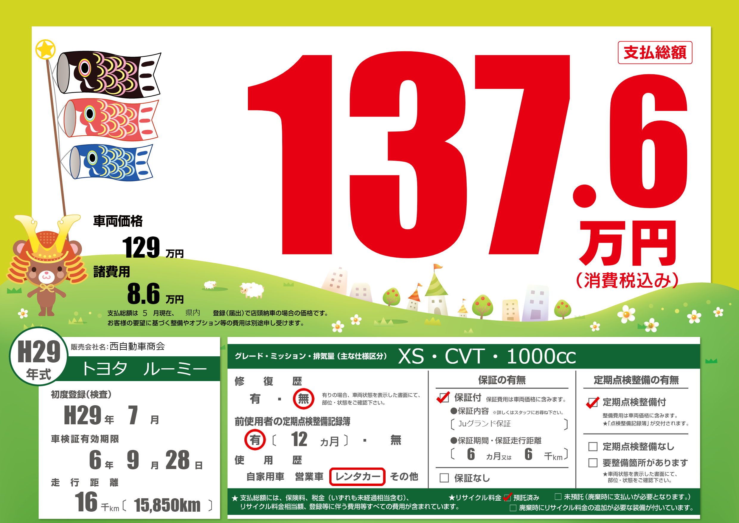 | 走行キロ | 1.6万km | 初年度登録 | H29年7月 |