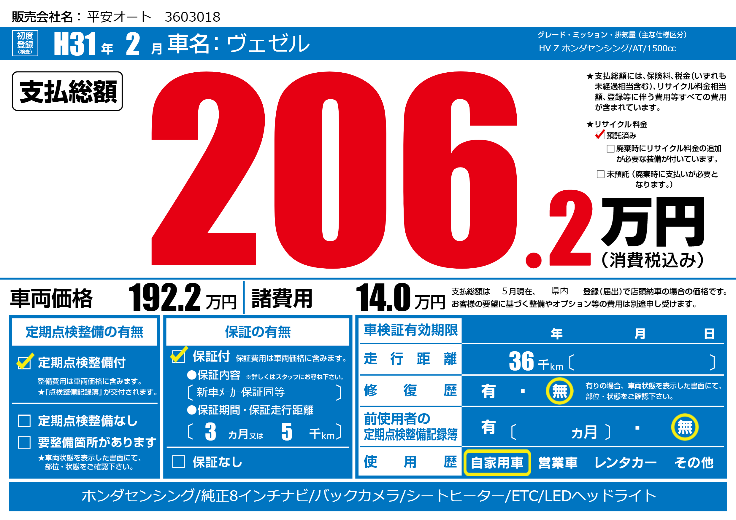 | 車名 | ヴェゼル | グレード ミッション 排気量 |