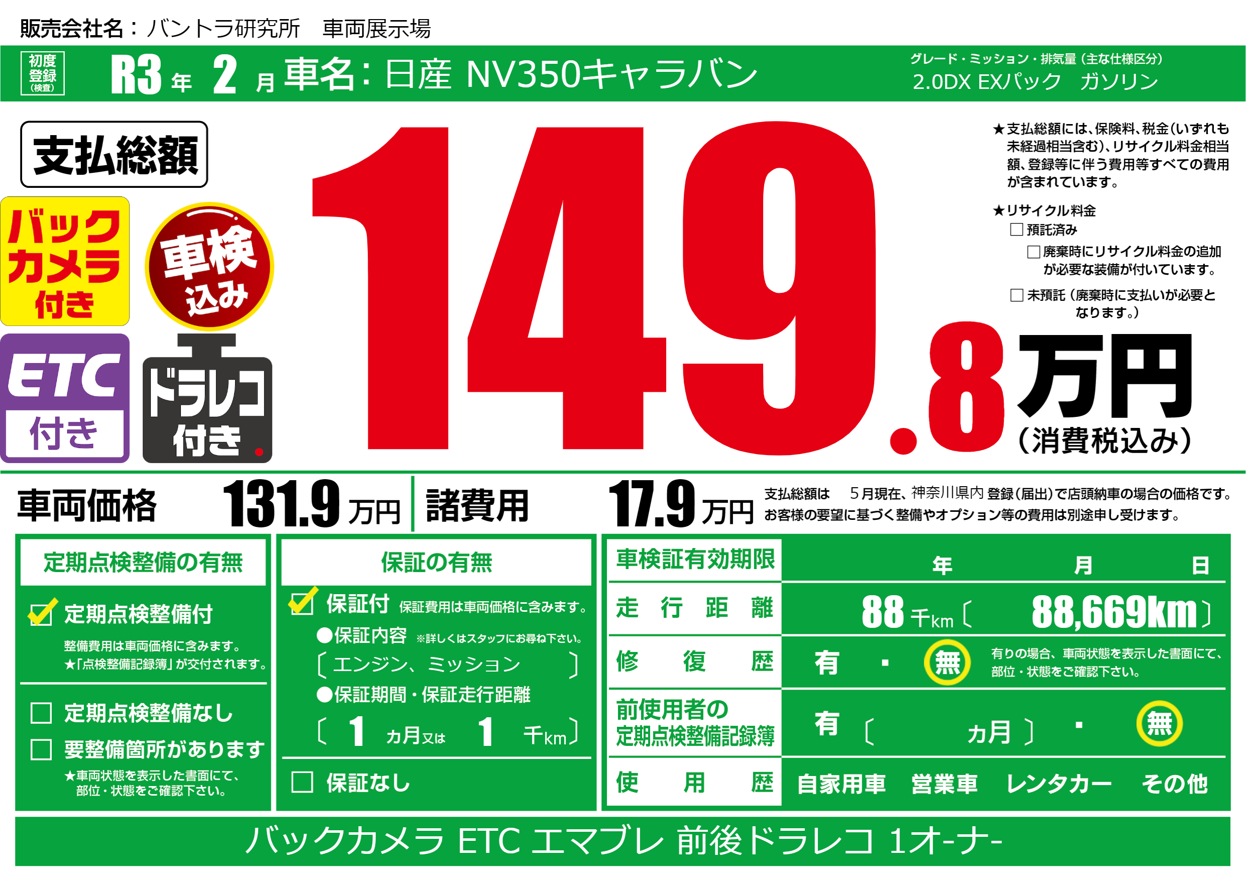 | 車名 | 日産 NV350キャラバン | グレード ミッション 排気量 |