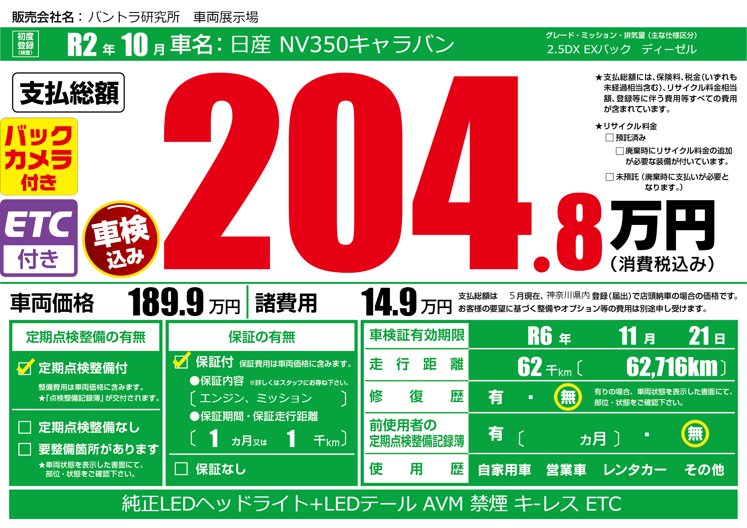 | 車名 | 日産 NV350キャラバン | グレード ミッション 排気量 |