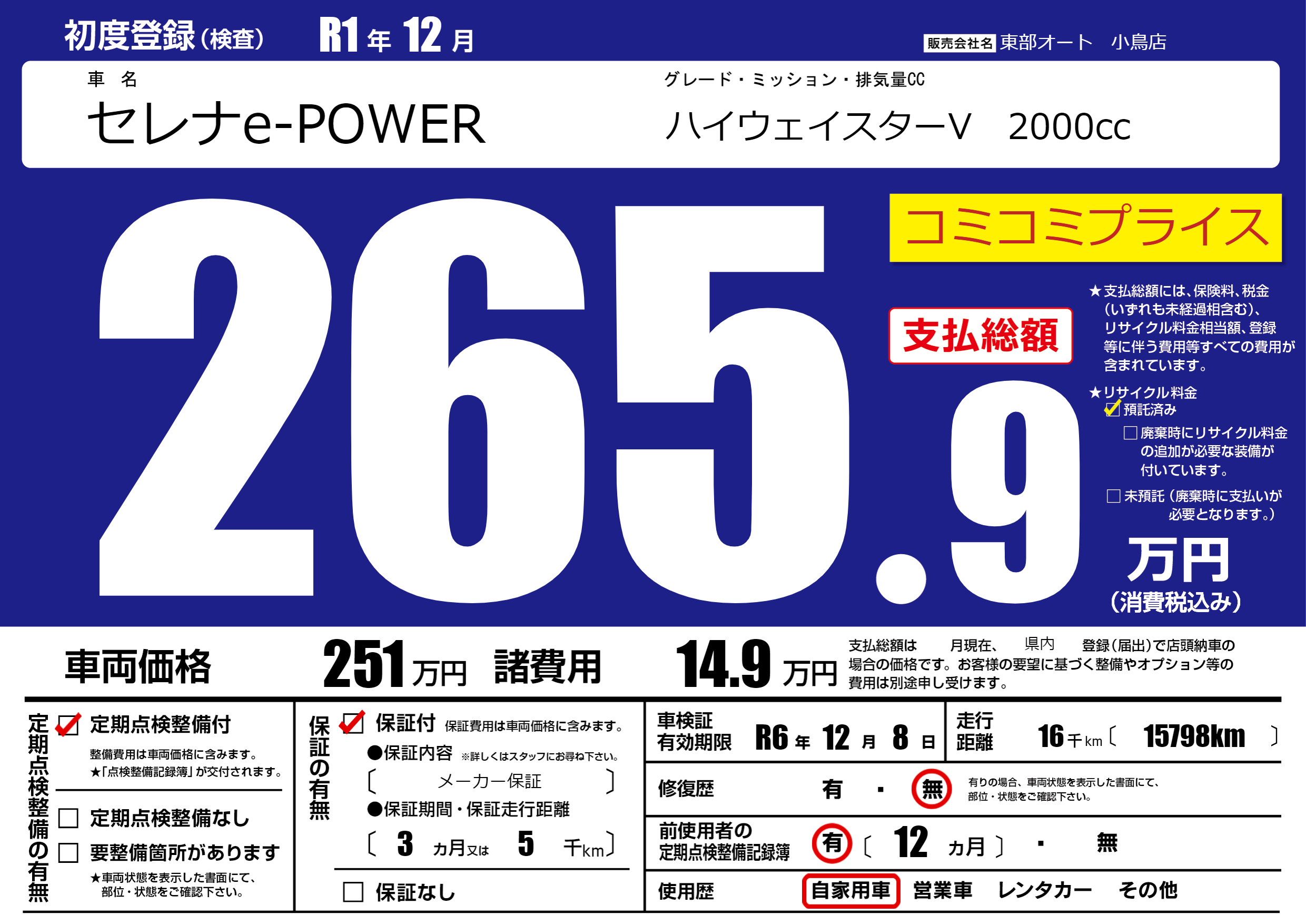 | 車名 | セレナe-POWER | グレード ミッション 排気量 |