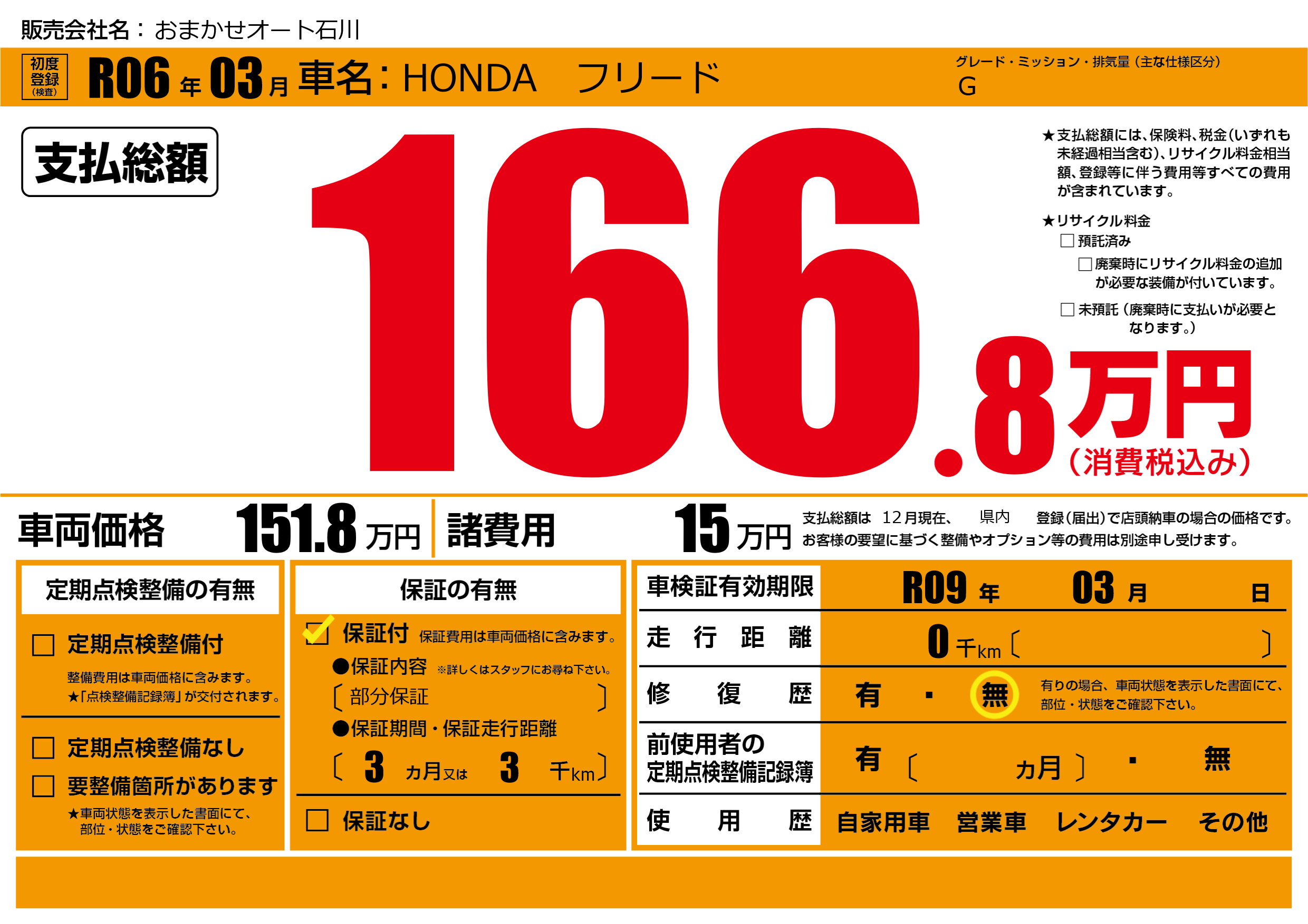 | 車名 | HONDA フリード | グレード ミッション 排気量 |