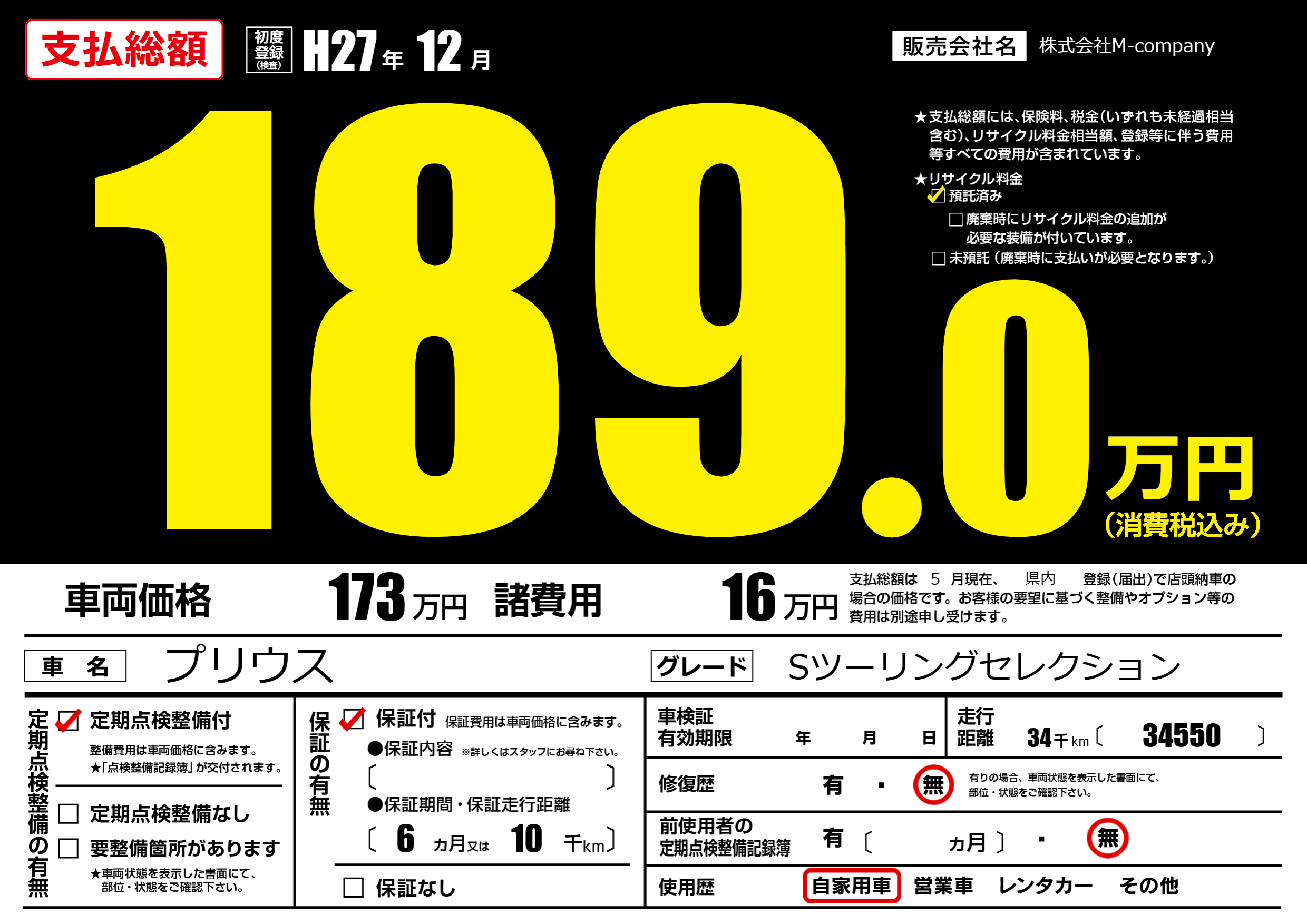 | 車検制限 | - 年 - 月 - 日 | ||