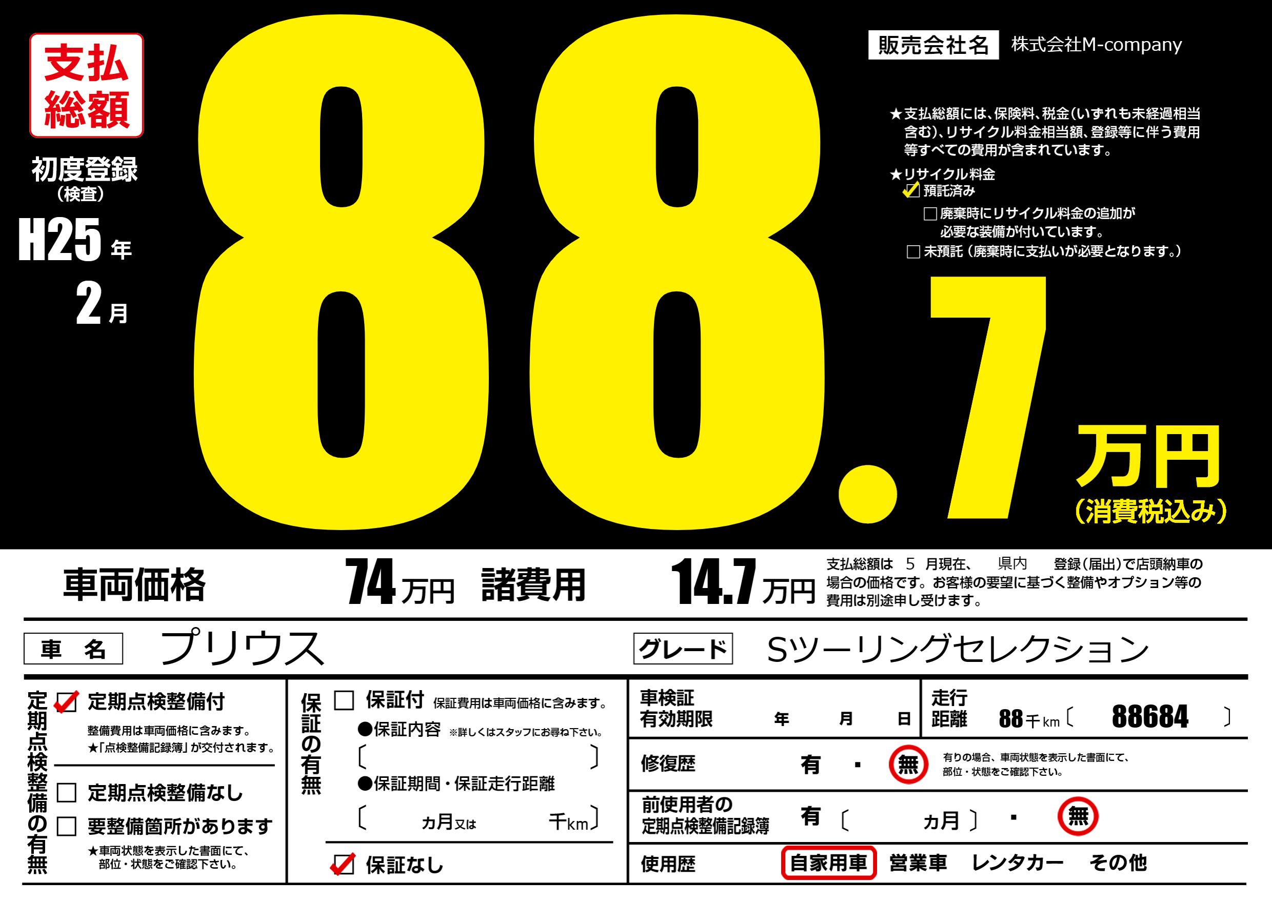 | 走行キロ | 8.8万km | 初年度登録 | H25年2月 |
