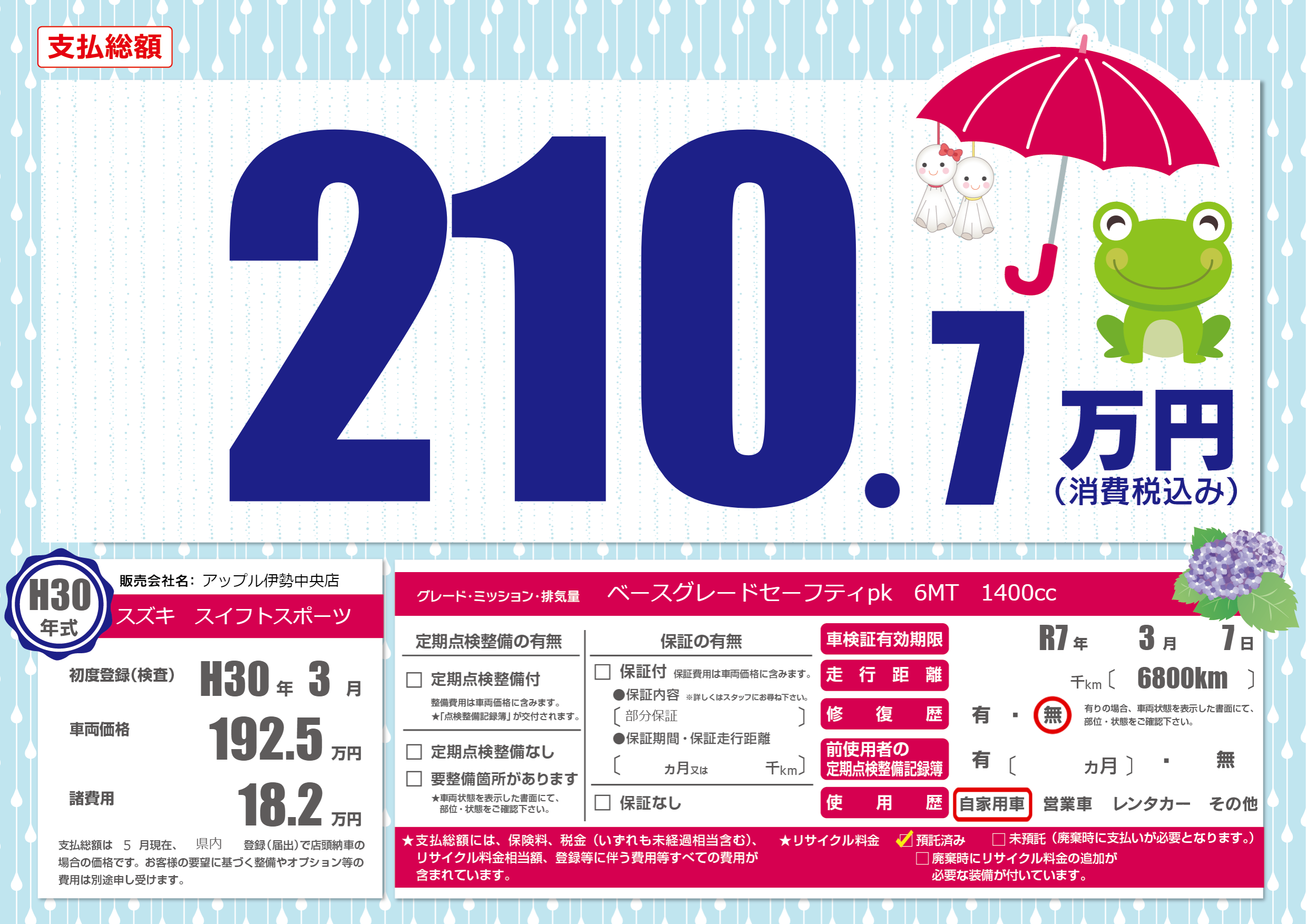| 車名 | スズキ スイフトスポーツ | グレード ミッション 排気量 |