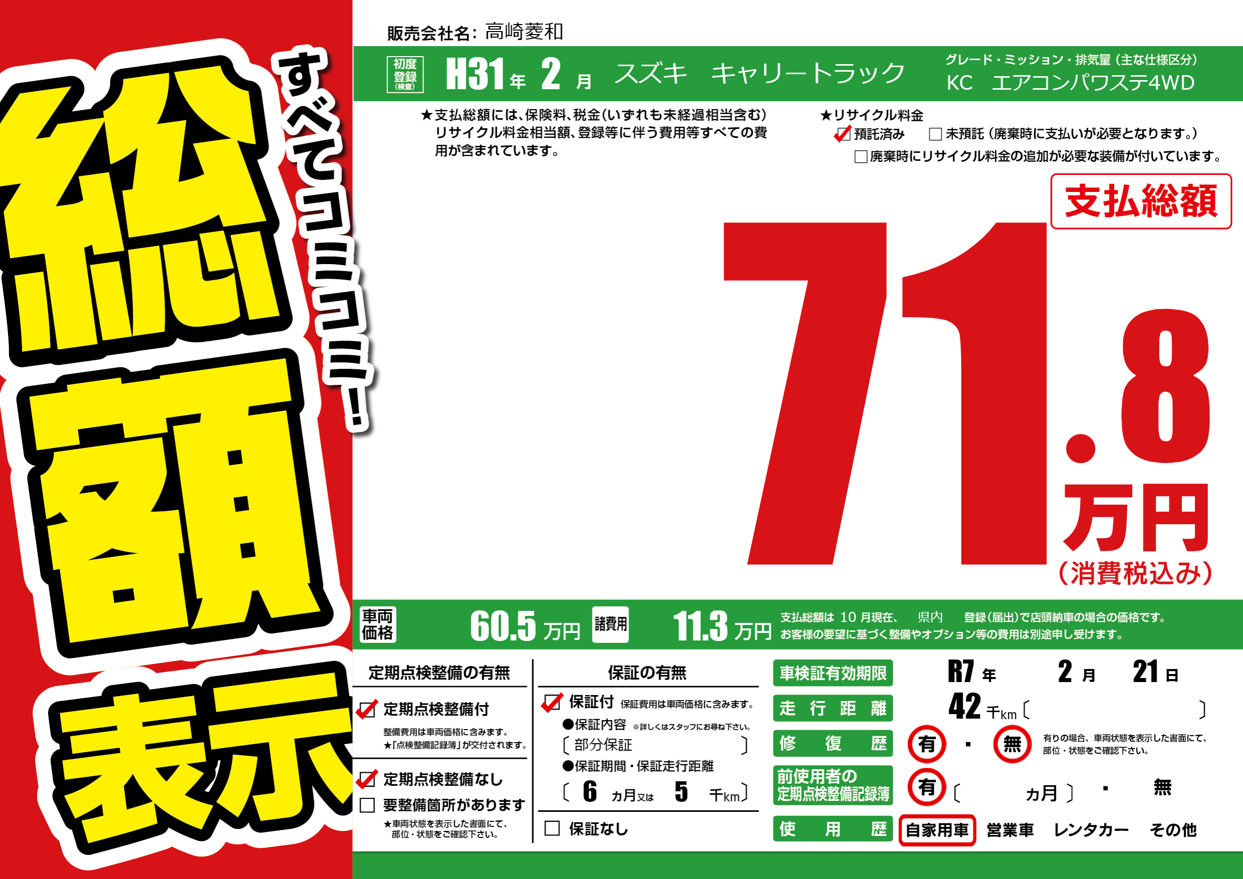 | 車検制限 | R7年 2月 21日 | ||