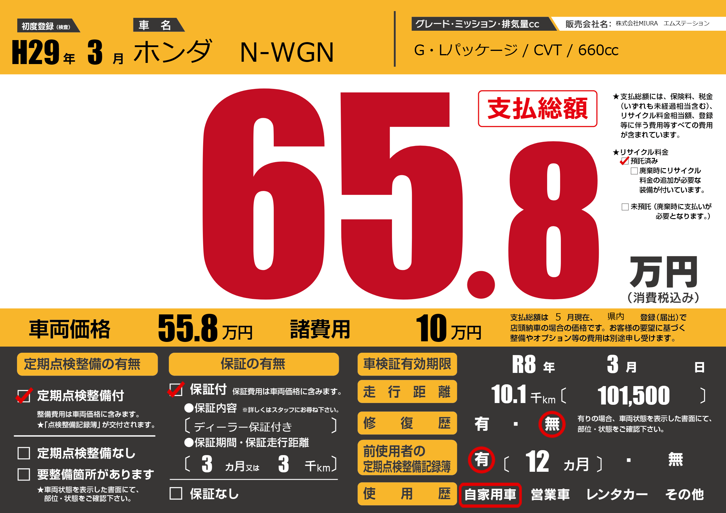 | 車名 | ホンダ N-WGN | グレード ミッション 排気量 |
