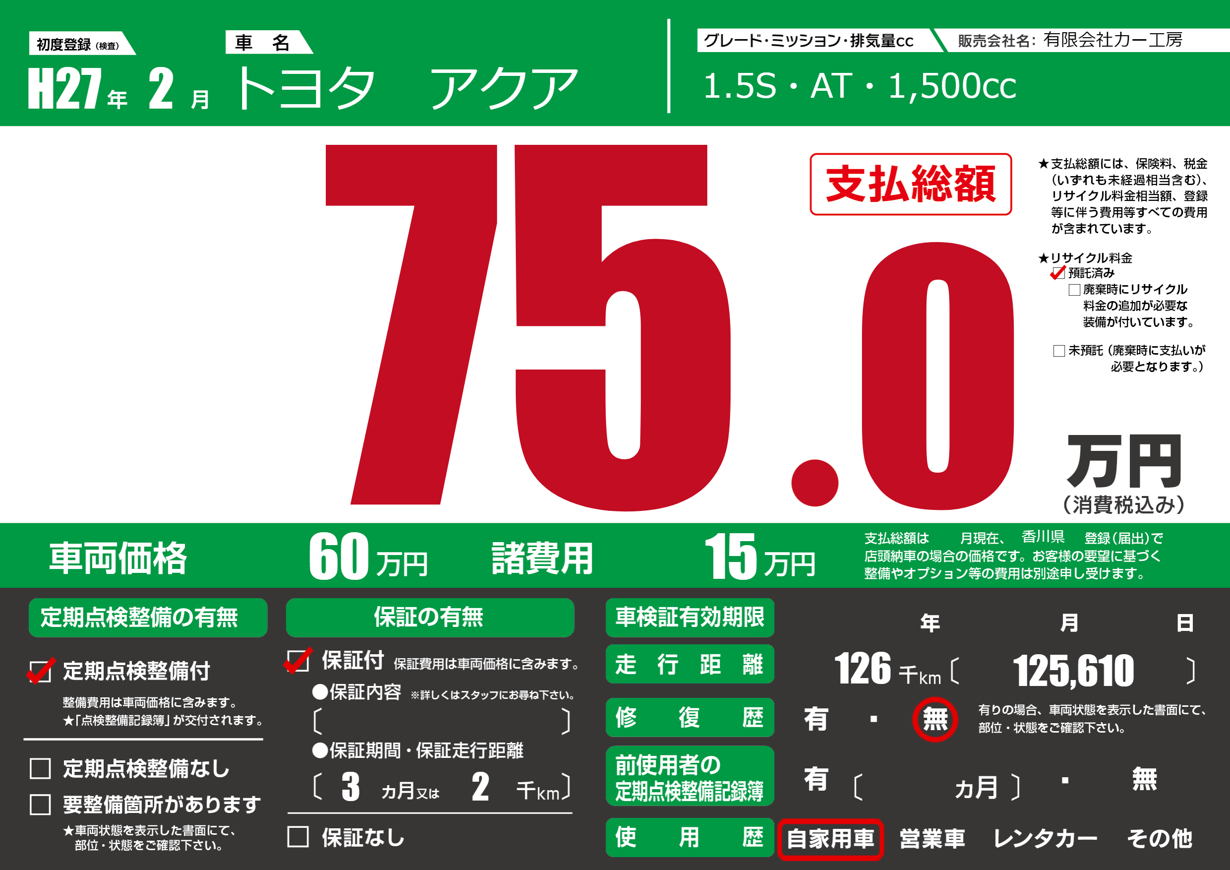 | 走行キロ | 12.6万km | 初年度登録 | H27年2月 |