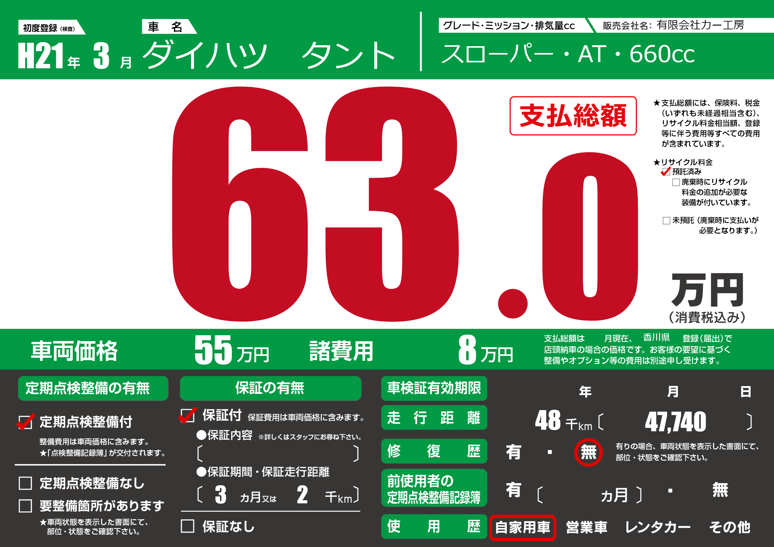 | 車名 | ダイハツ タント | グレード ミッション 排気量 |