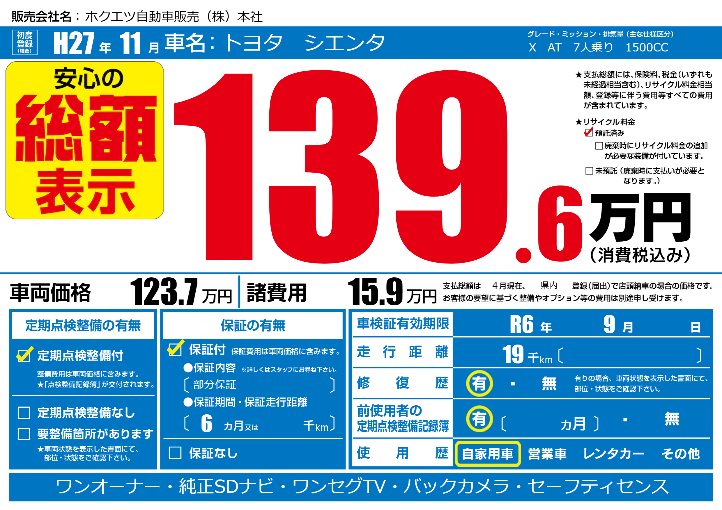 | 車名 | トヨタ シエンタ | グレード ミッション 排気量 |
