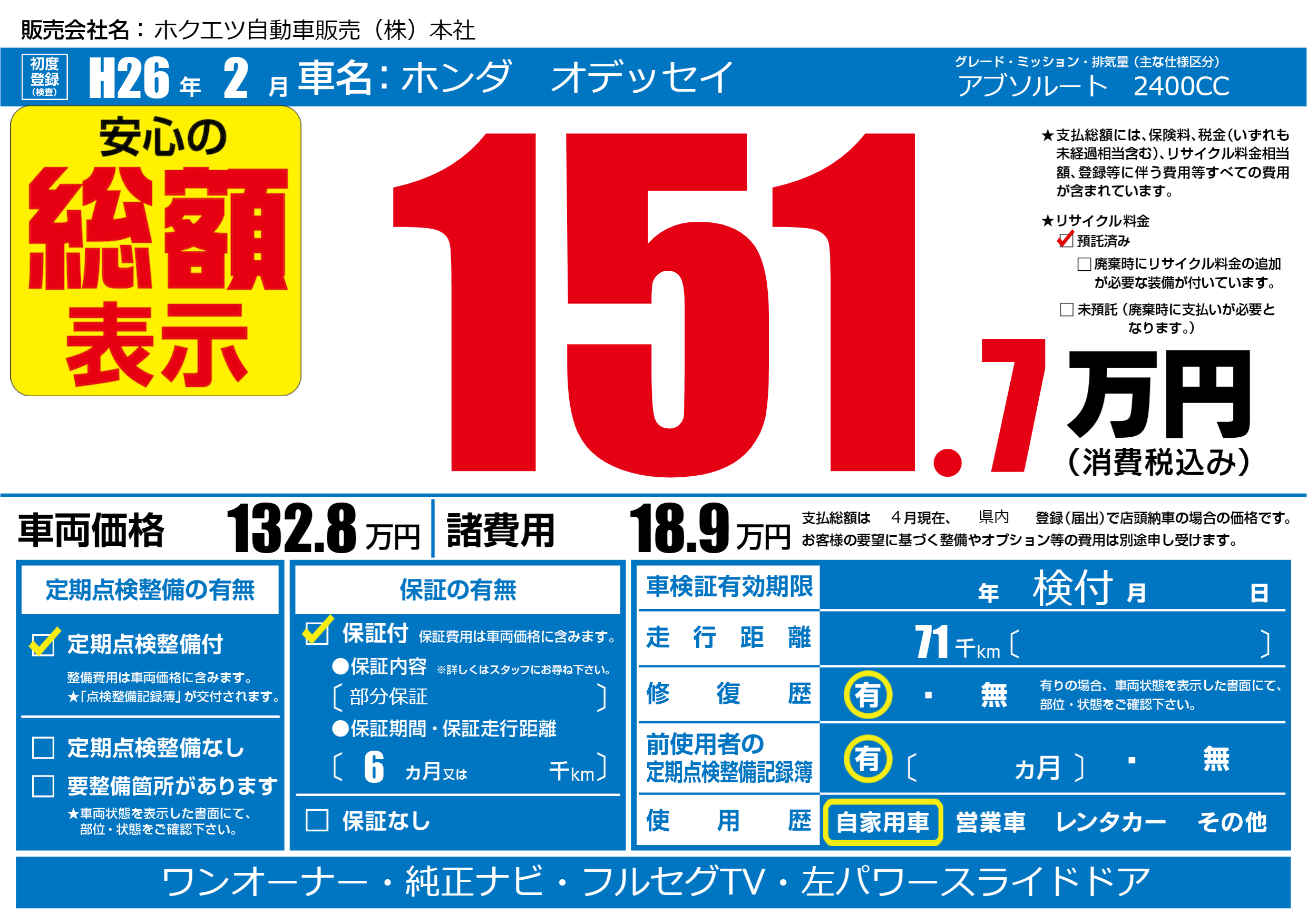 | 車名 | ホンダ オデッセイ | グレード ミッション 排気量 |