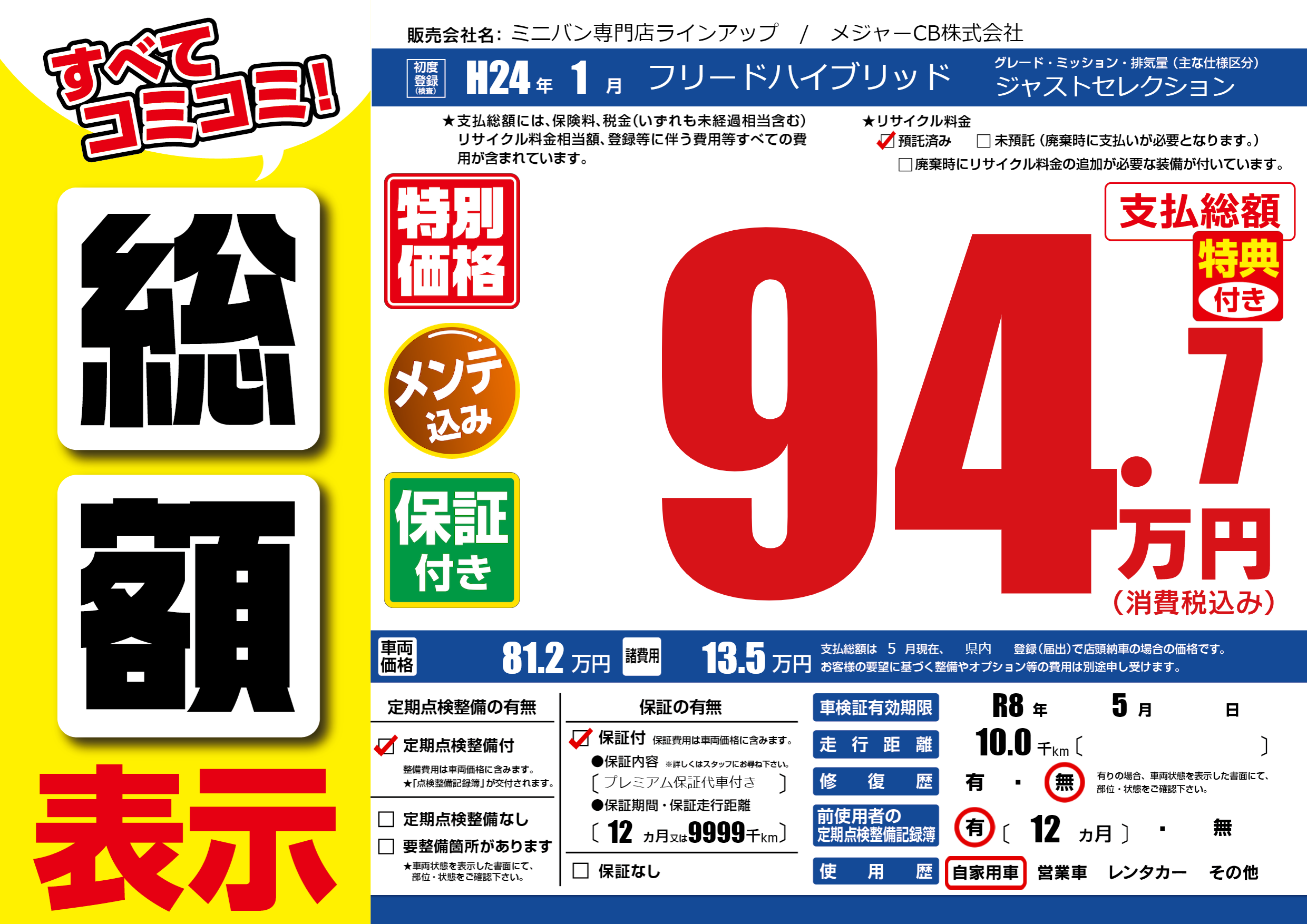 保証付き 保証内容(プレミアム保証代車付き) 12ヶ月または(9999)千kmまで |