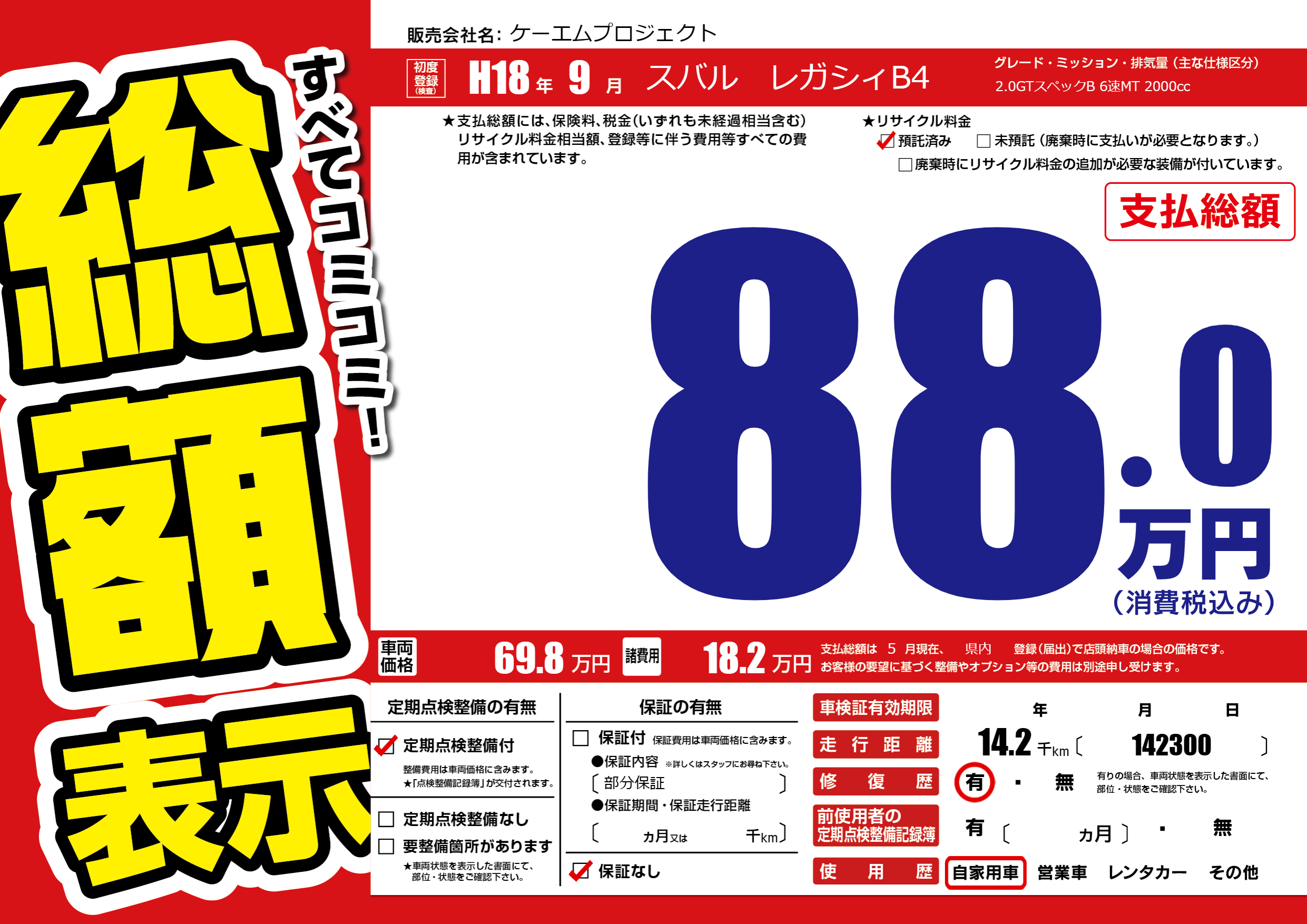 | 車名 | スバル レガシィB4 | グレード ミッション 排気量 |