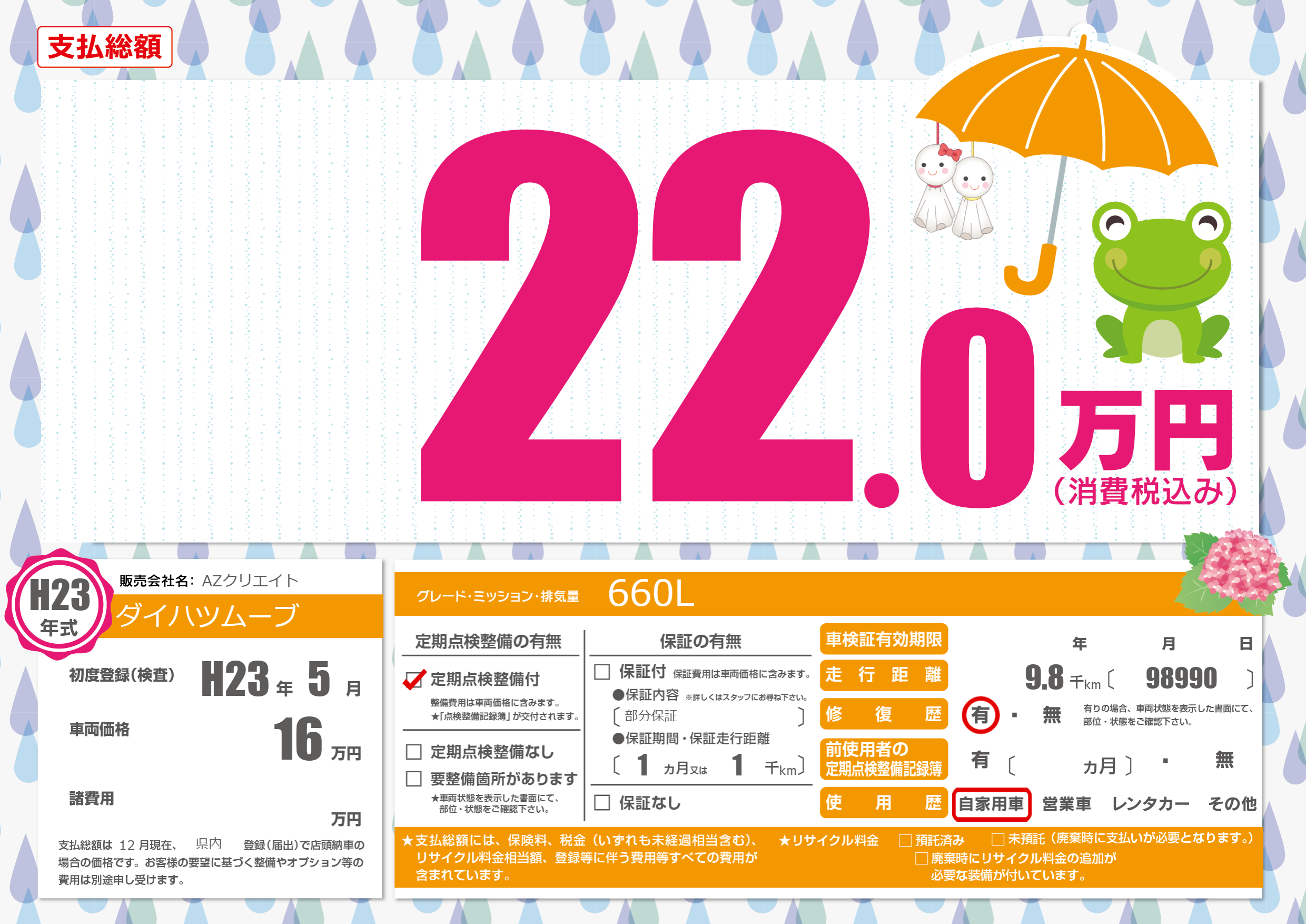 | 走行キロ | 0.9万km | 初年度登録 | H23年5月 |