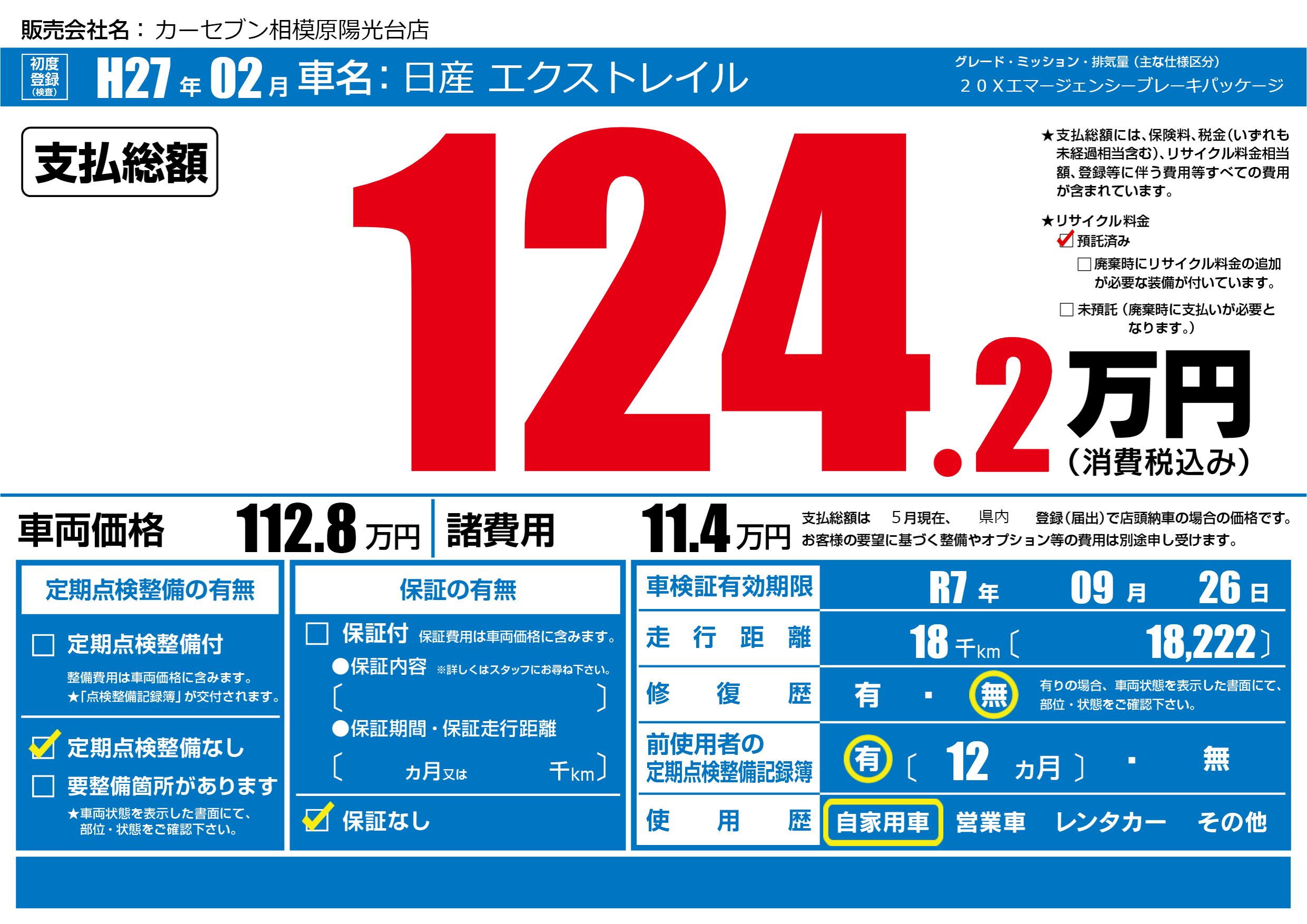 | 車名 | 日産 エクストレイル | グレード ミッション 排気量 |