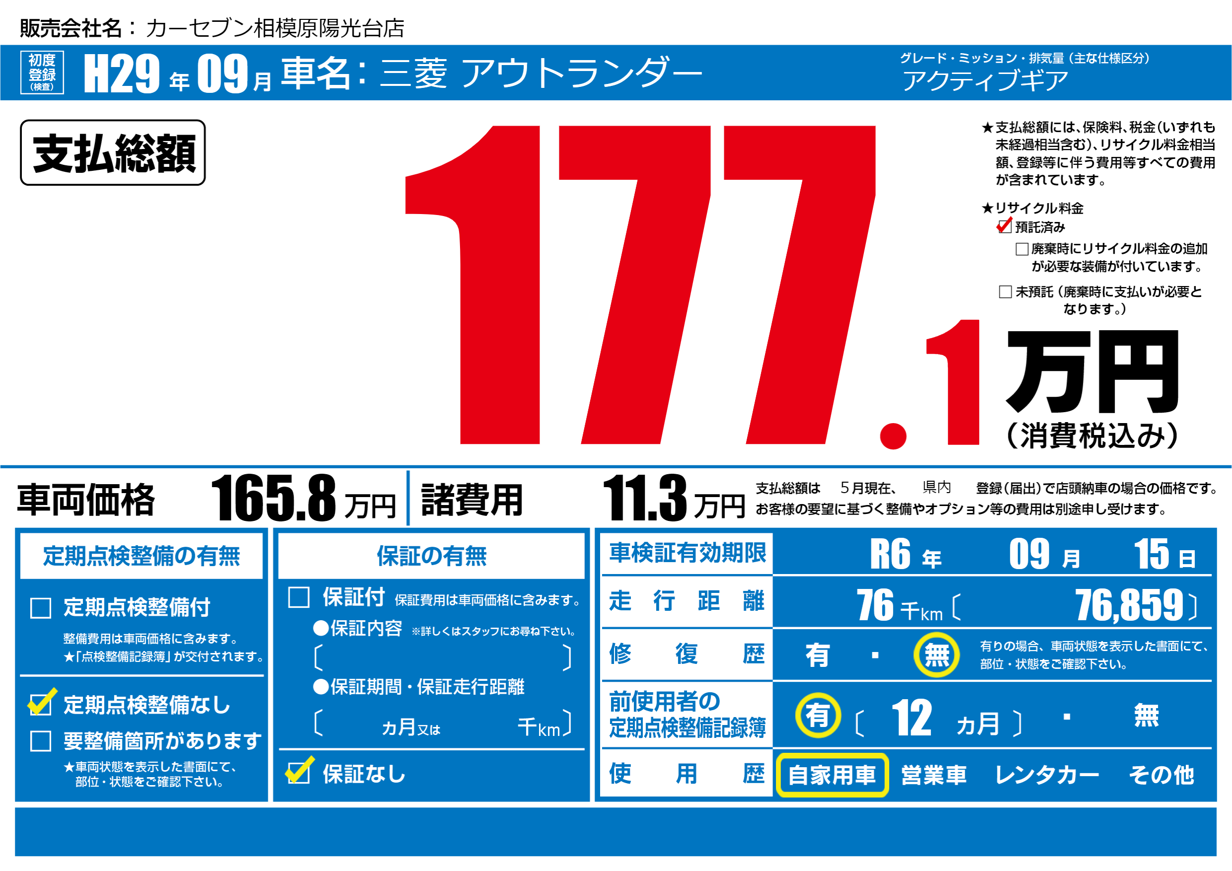 | 車検制限 | R6年 09月 15日 | ||
