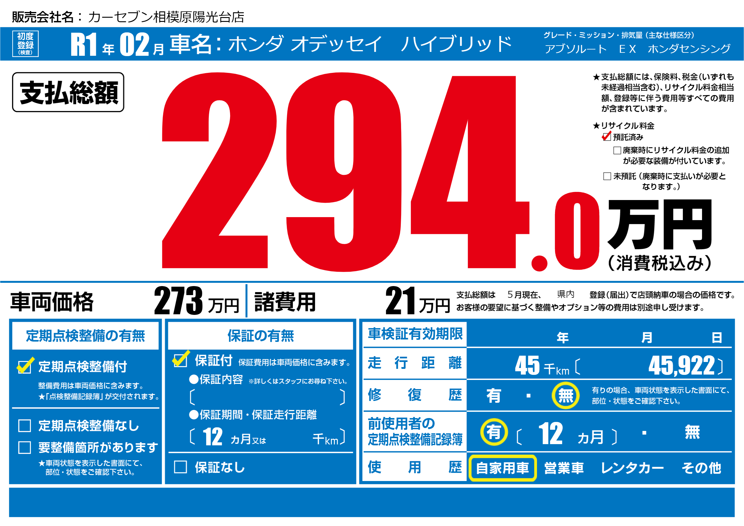 | 車名 | ホンダ オデッセイ ハイブリッド | グレード ミッション 排気量 |
