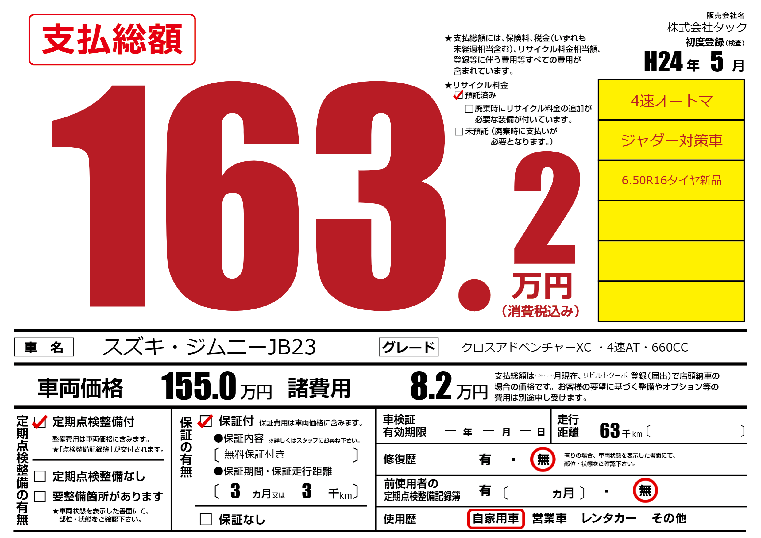 | 車名 | スズキ・ジムニーJB23 | グレード ミッション 排気量 |