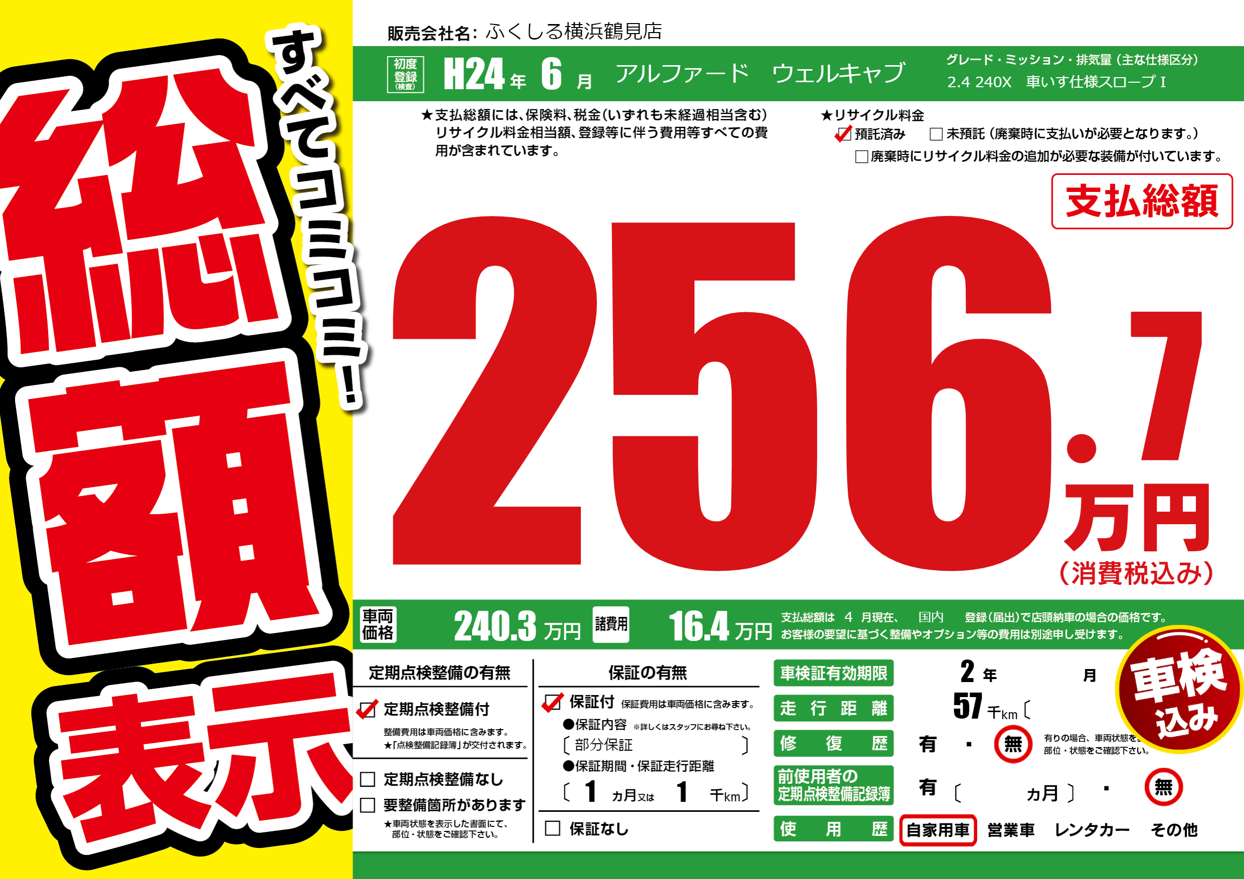 | 車名 | アルファード ウェルキャブ | グレード ミッション 排気量 |