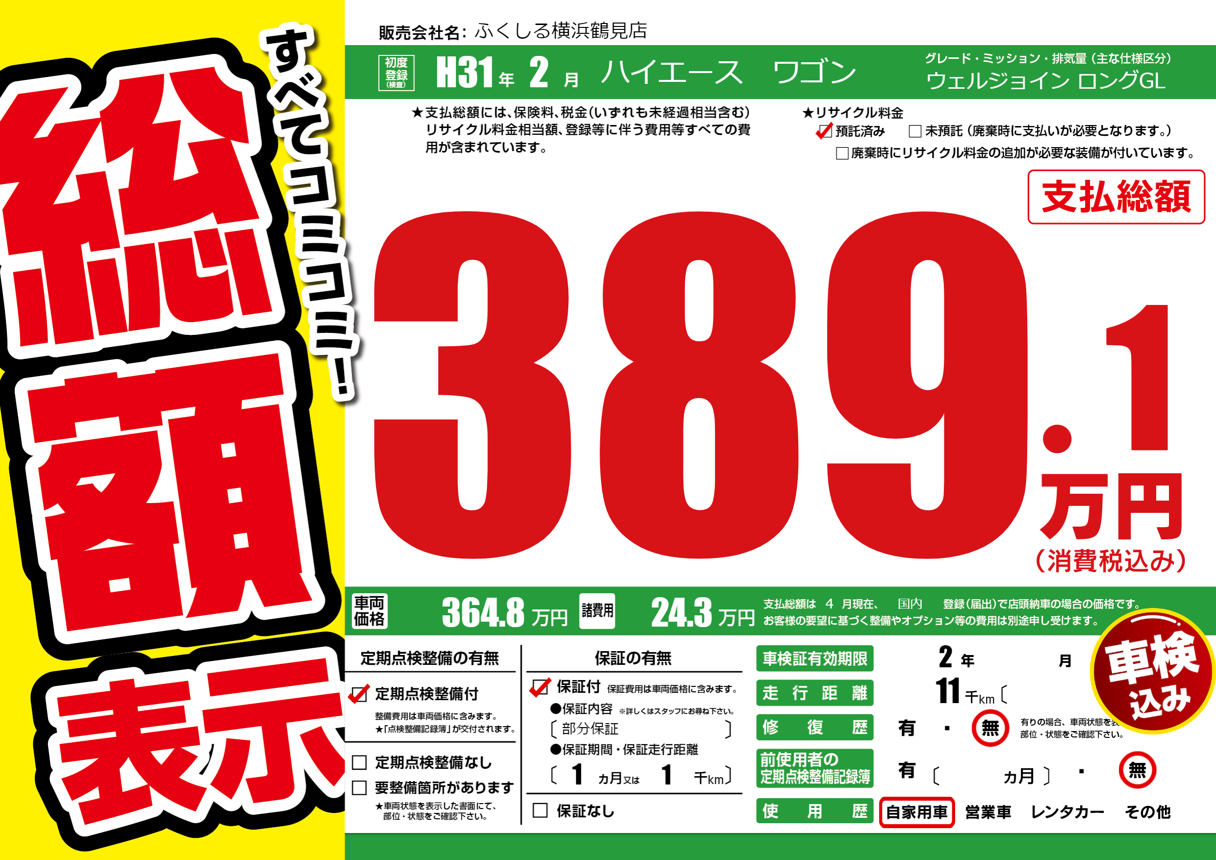 | 車名 | ハイエース ワゴン | グレード ミッション 排気量 |