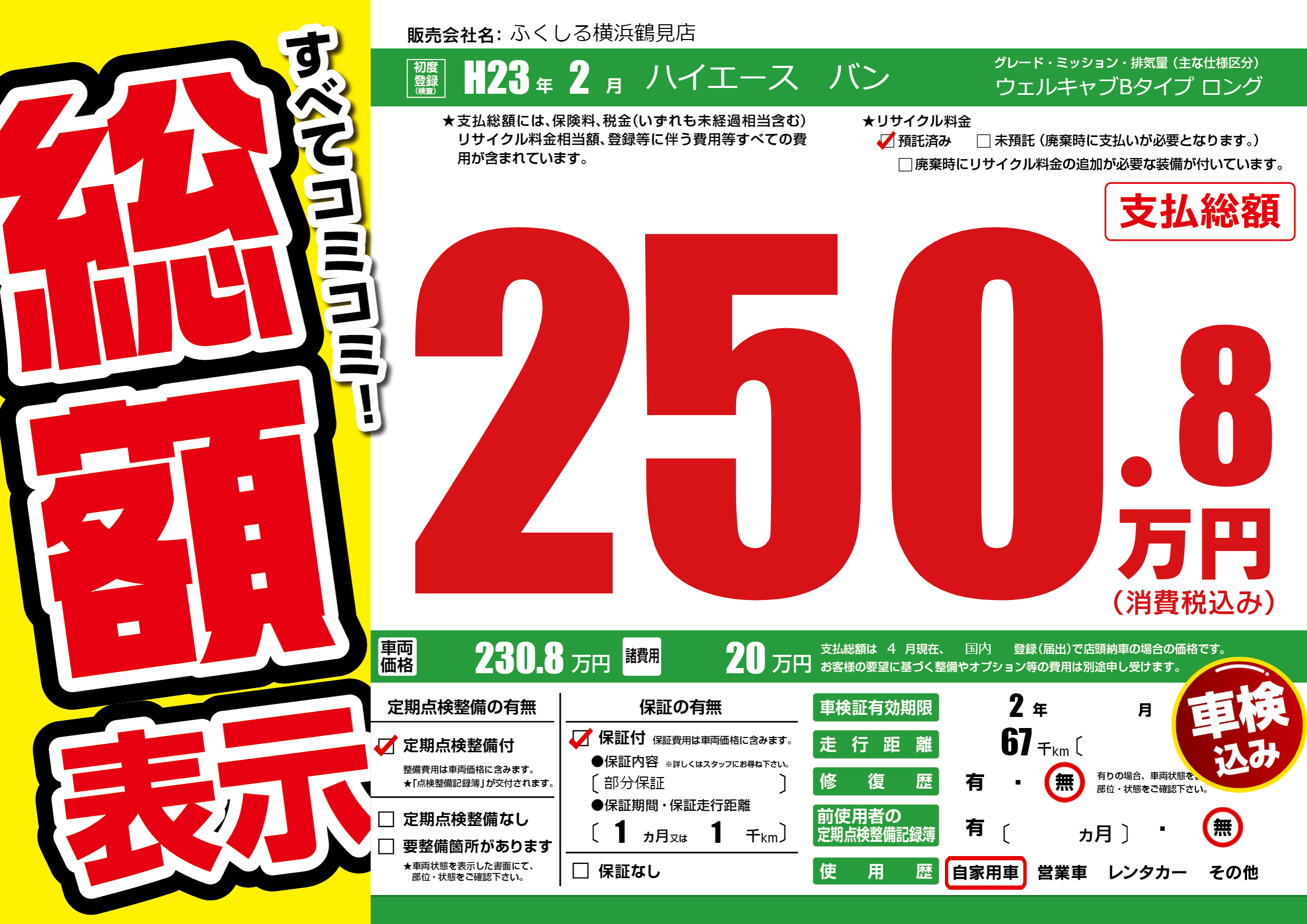| 走行キロ | 6.7万km | 初年度登録 | H23年2月 |