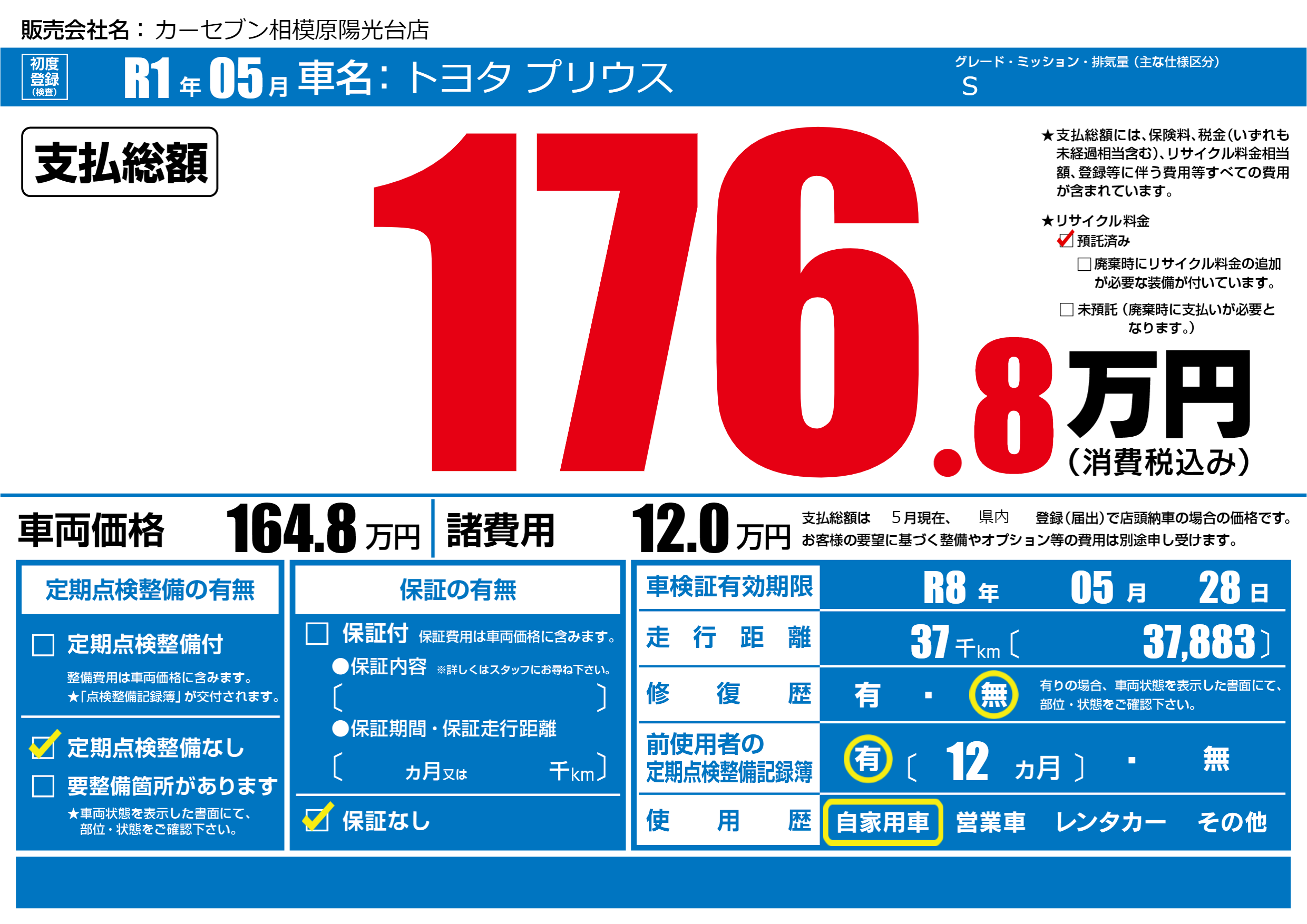 | 車名 | トヨタ プリウス | グレード ミッション 排気量 |