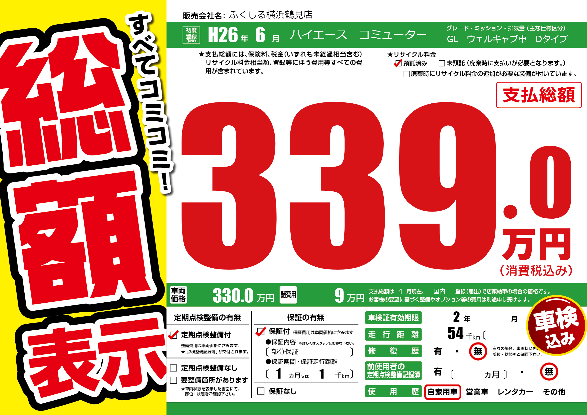 | 車名 | ハイエース コミューター | グレード ミッション 排気量 |