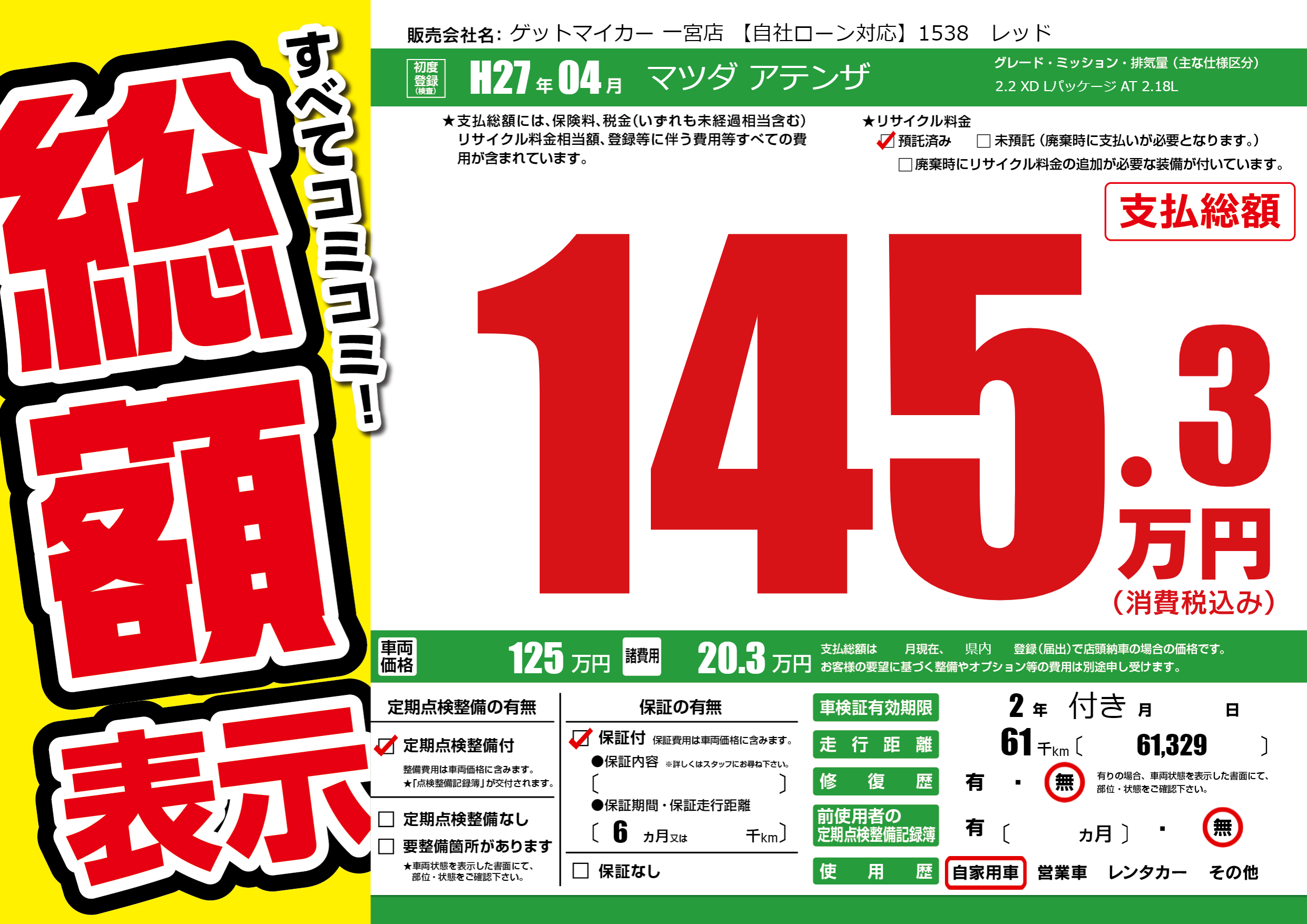 | 車名 | マツダ アテンザ | グレード ミッション 排気量 |