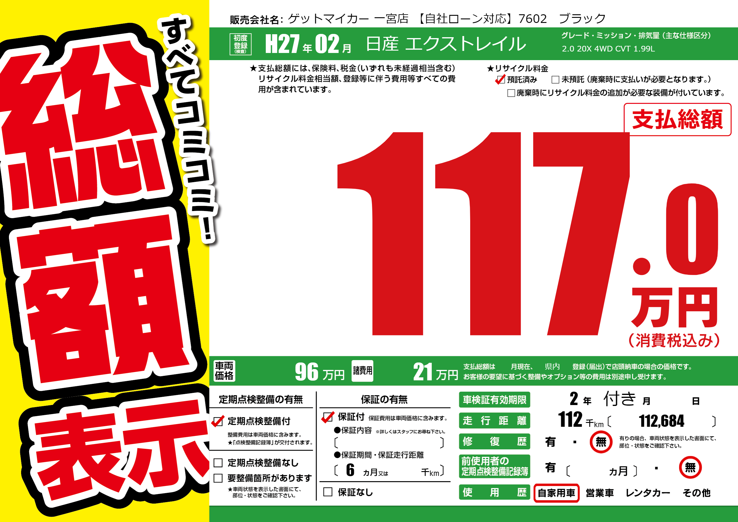 | 車名 | 日産 エクストレイル | グレード ミッション 排気量 |