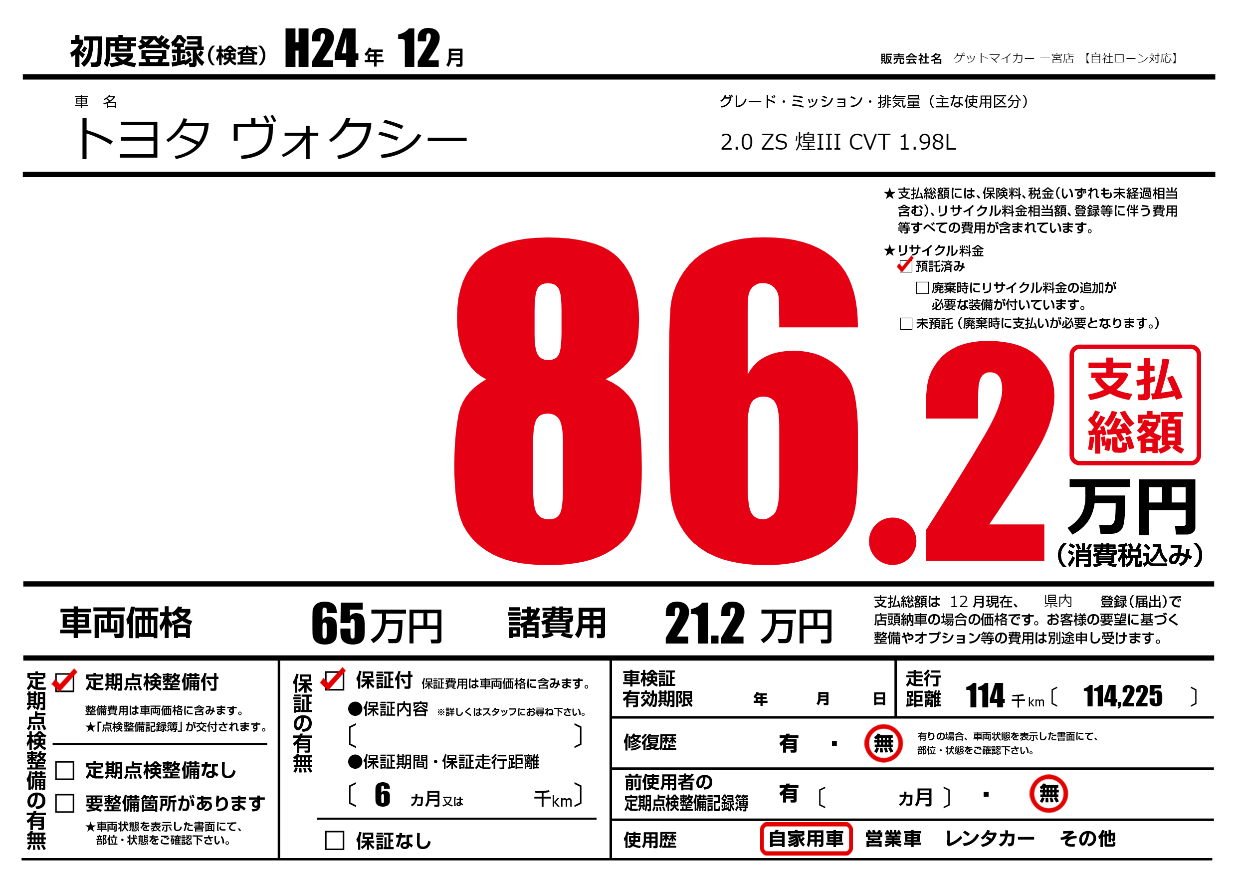 | 走行キロ | 11.4万km | 初年度登録 | H24年12月 |