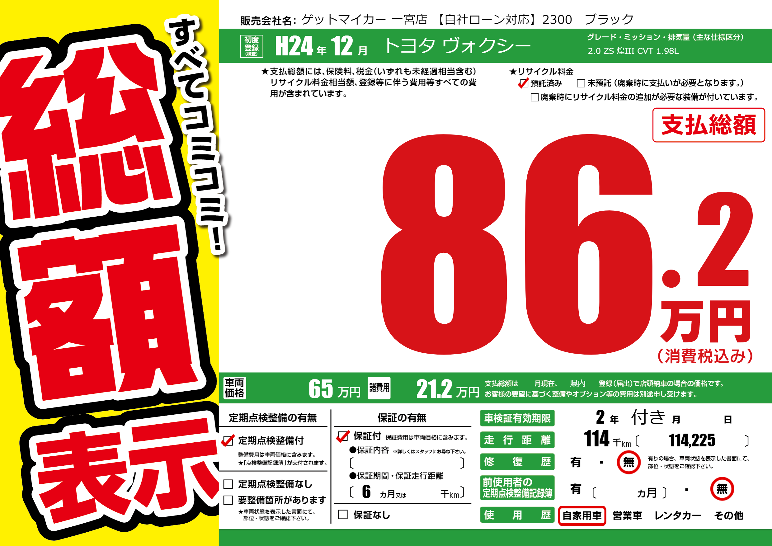 | 走行キロ | 11.4万km | 初年度登録 | H24年12月 |