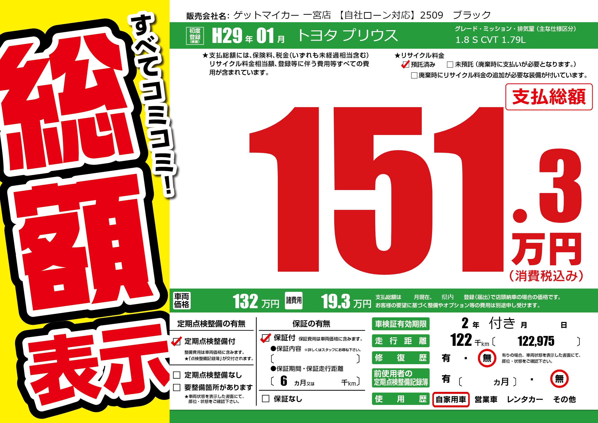 | 車名 | トヨタ プリウス | グレード ミッション 排気量 |