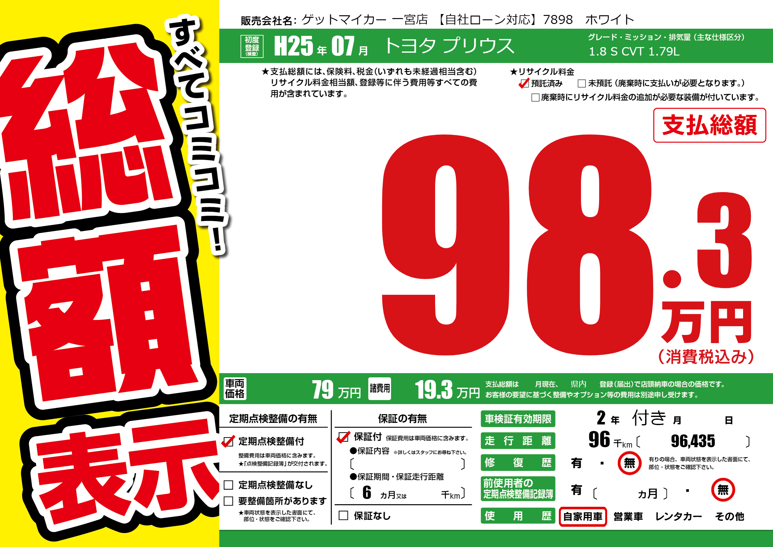 | 車名 | トヨタ プリウス | グレード ミッション 排気量 |