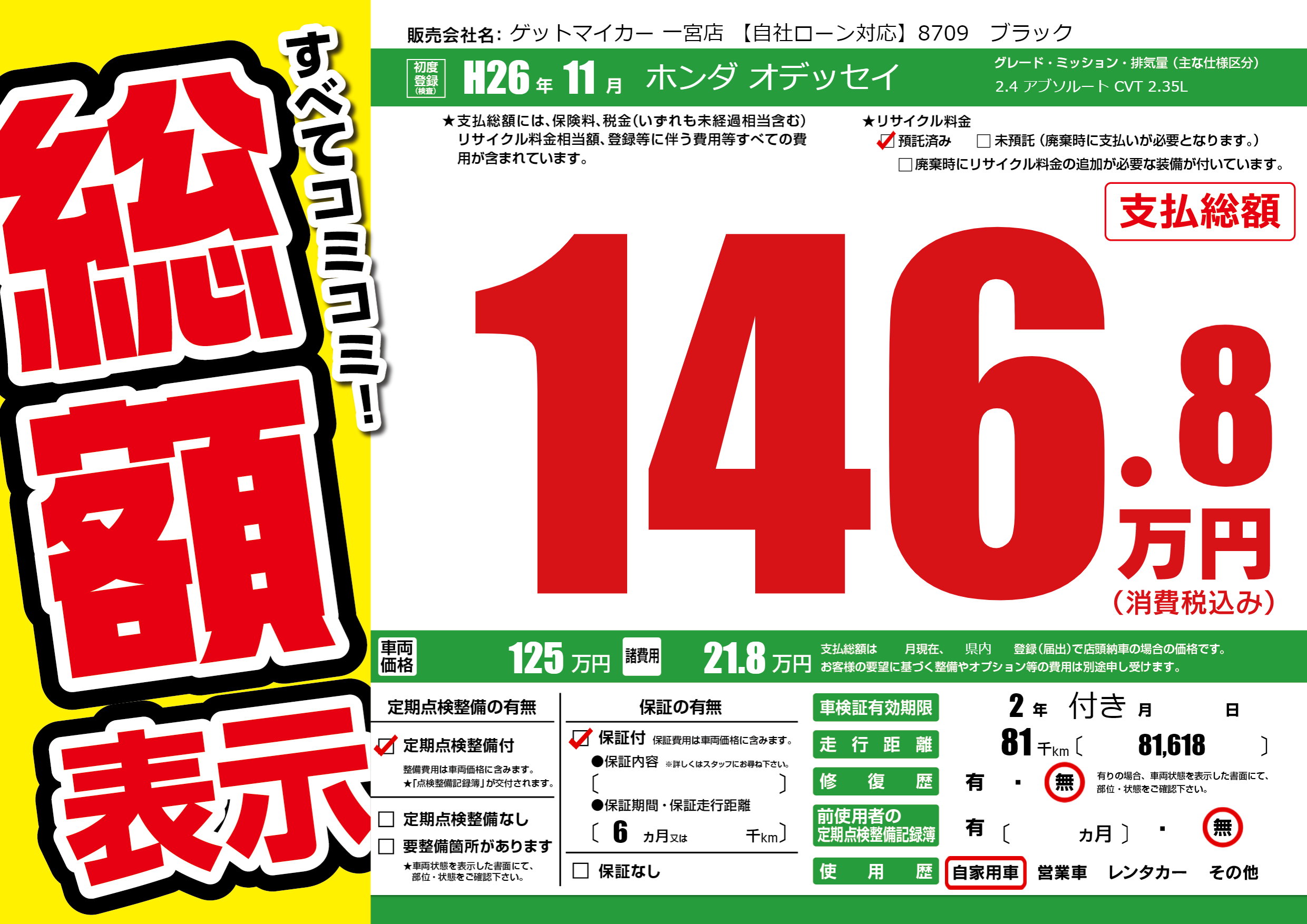 | 走行キロ | 8.1万km | 初年度登録 | H26年11月 |