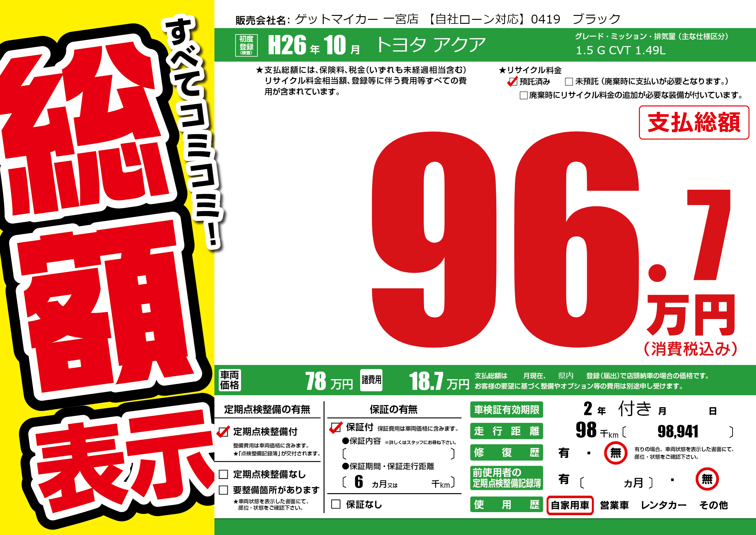 | 車名 | トヨタ アクア | グレード ミッション 排気量 |
