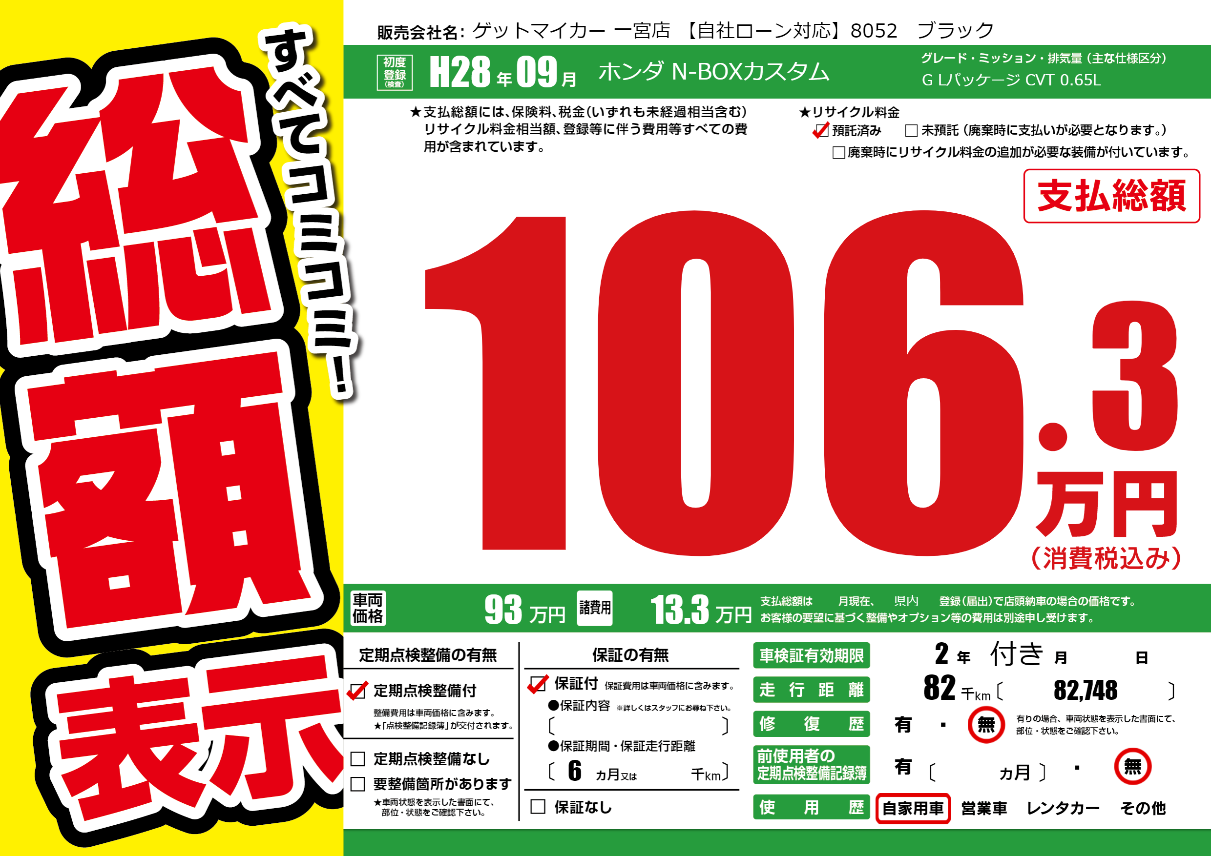 | 車名 | ホンダ N-BOXカスタム | グレード ミッション 排気量 |