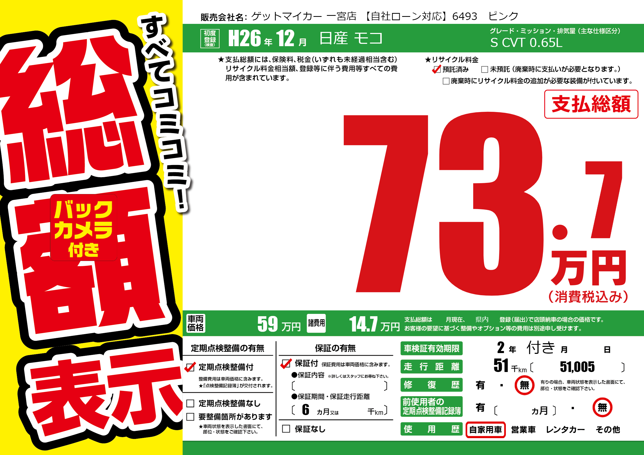 | 車名 | 日産 モコ | グレード ミッション 排気量 |