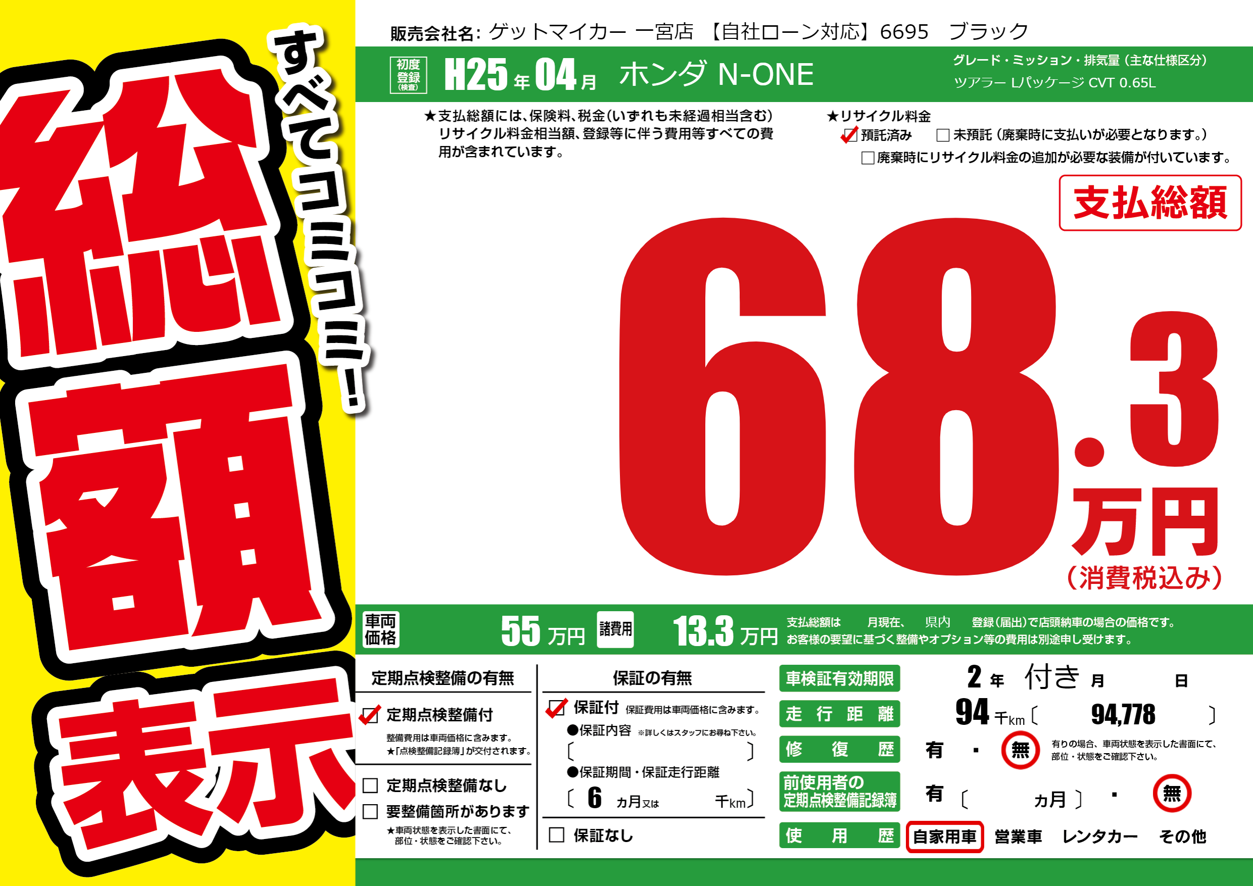 | 車名 | ホンダ N-ONE | グレード ミッション 排気量 |