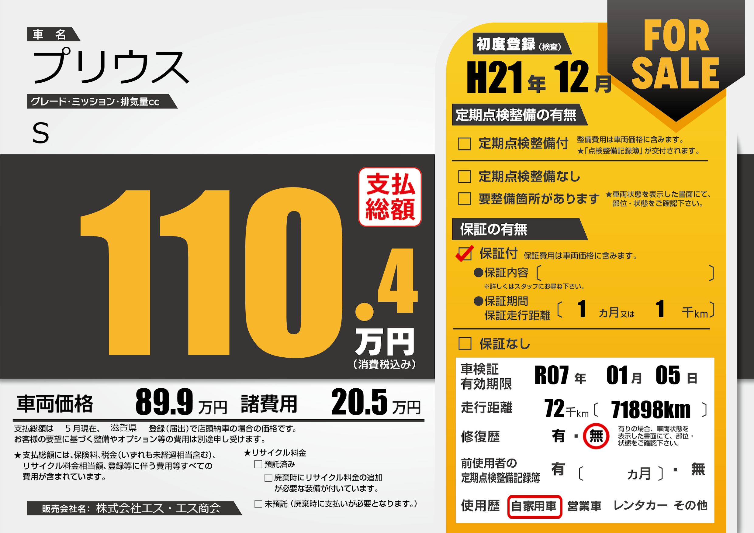 | 車名 | プリウス | グレード ミッション 排気量 |