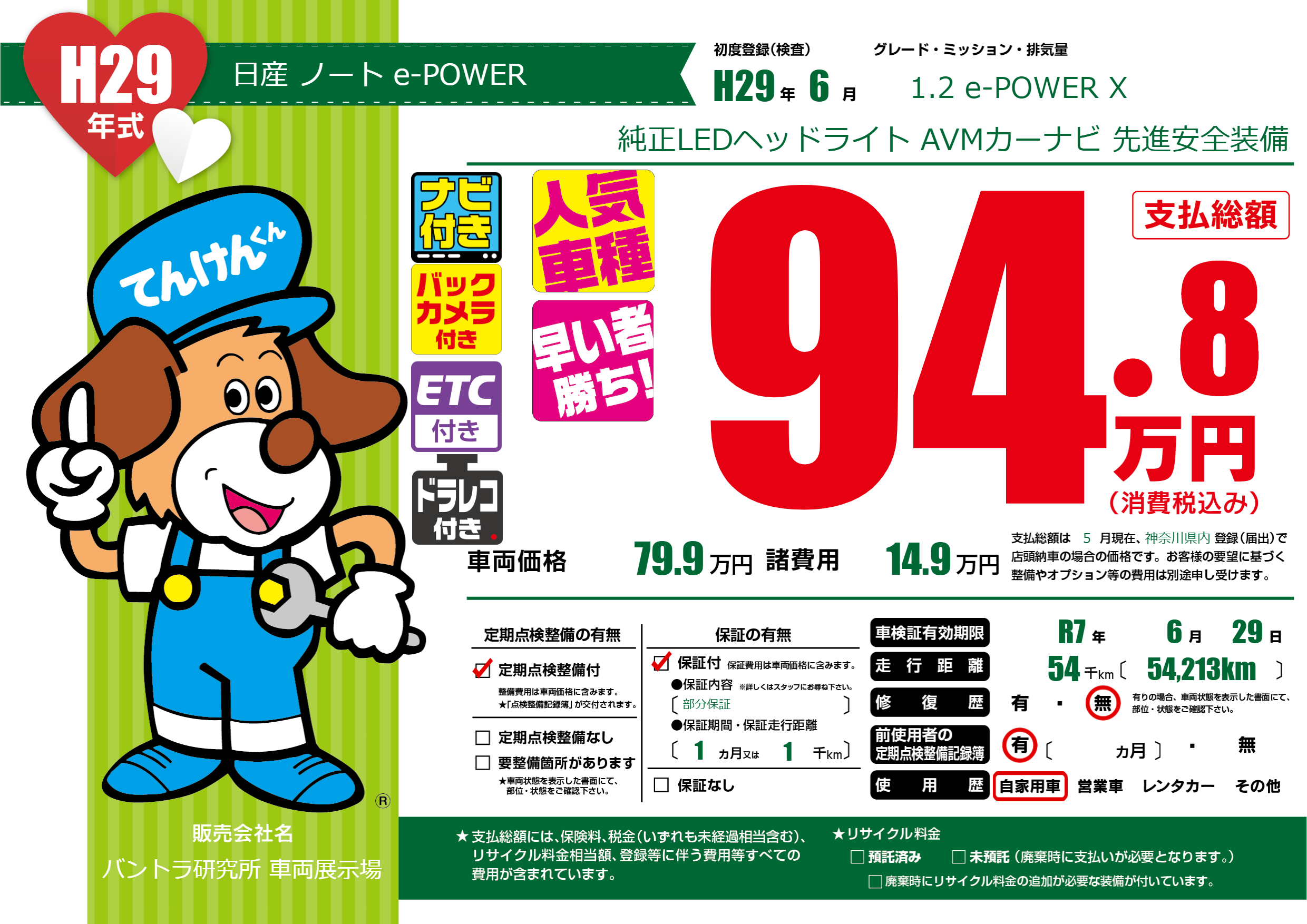 | 車名 | 日産 ノート e-POWER | グレード ミッション 排気量 |