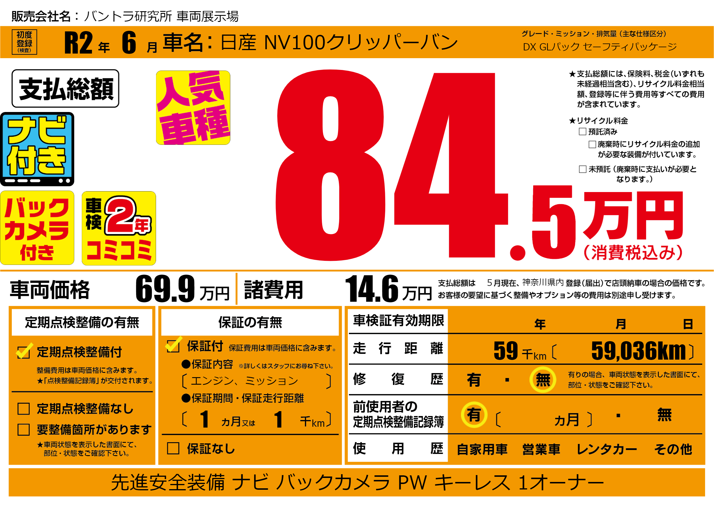 | 車名 | 日産 NV100クリッパーバン | グレード ミッション 排気量 |