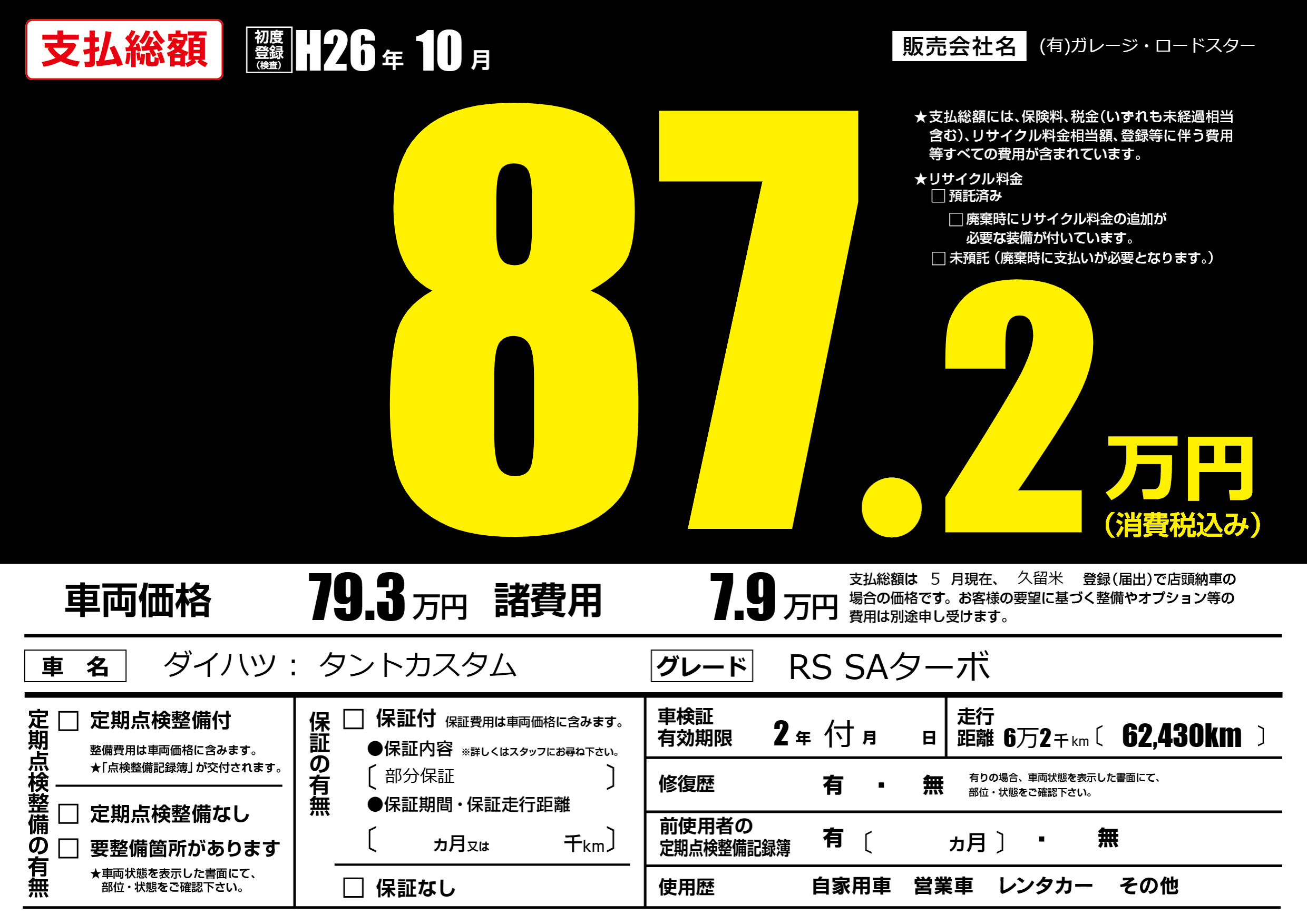 | 走行キロ | 0.6万km | 初年度登録 | H26年10月 |