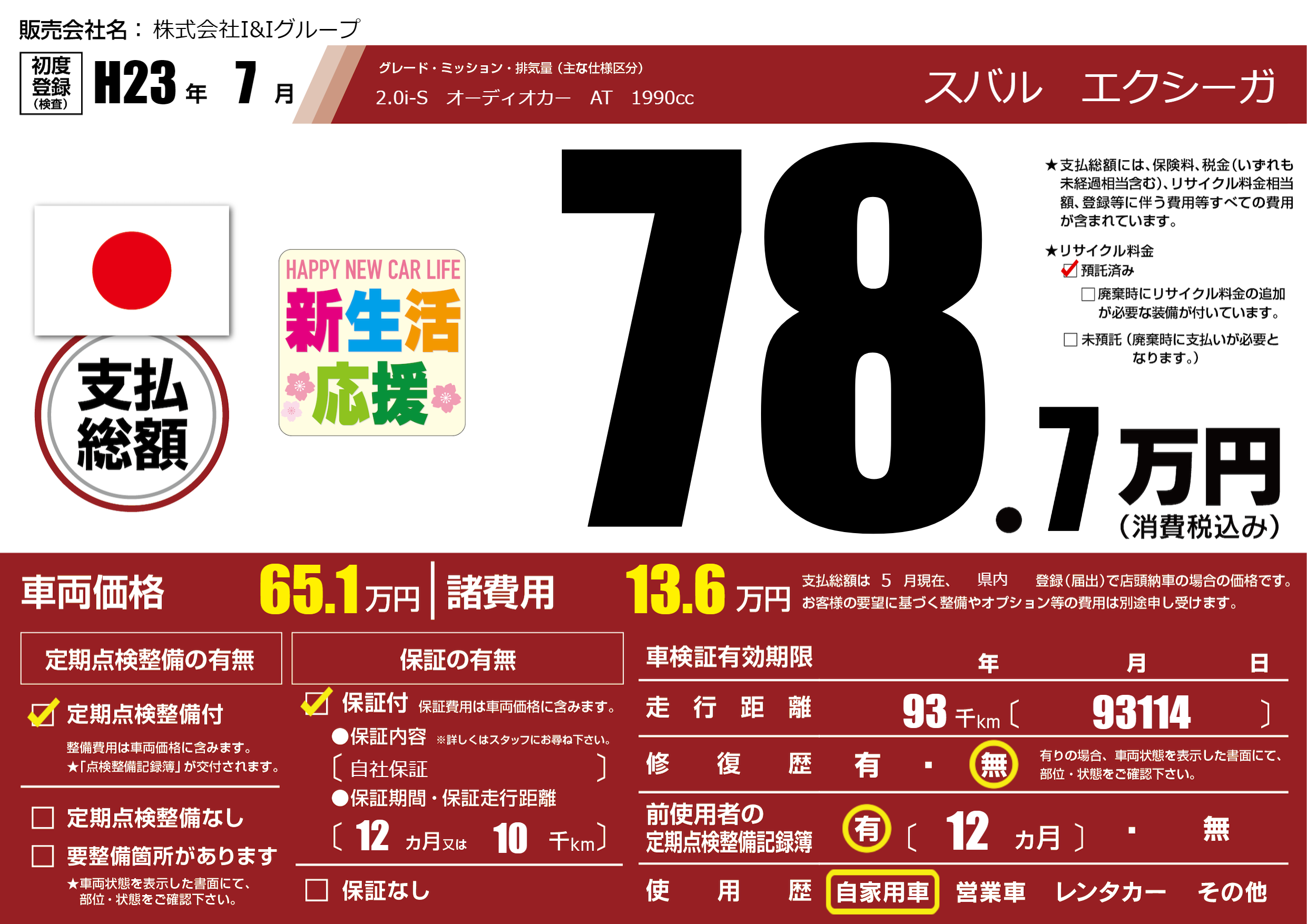 | 車名 | スバル エクシーガ | グレード ミッション 排気量 |
